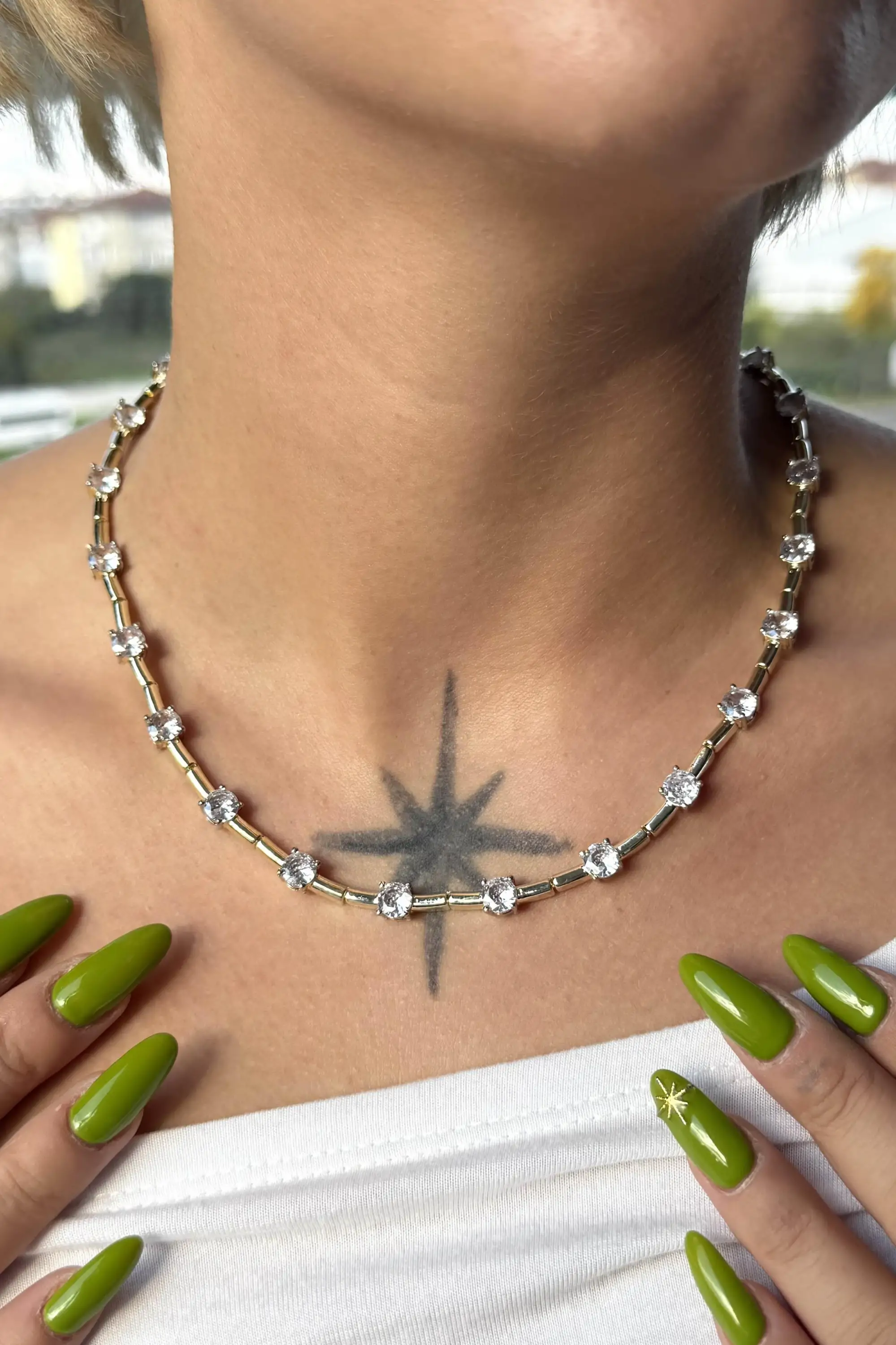 Gümüş Renk Taş Detaylı 14K Altın Kaplama VİP Kolye