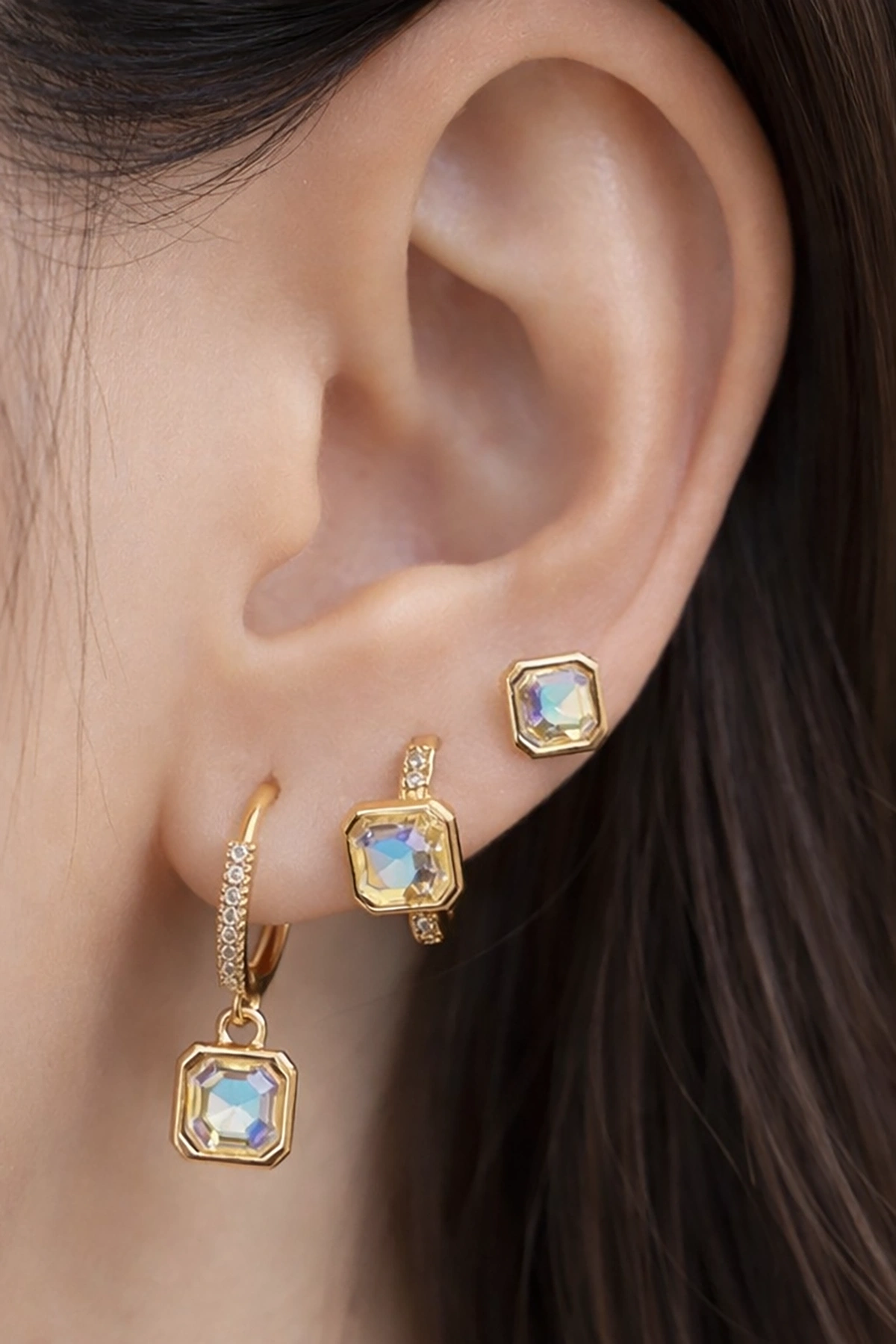 Altın Renk Taş Detaylı 3'lü Küpe Set