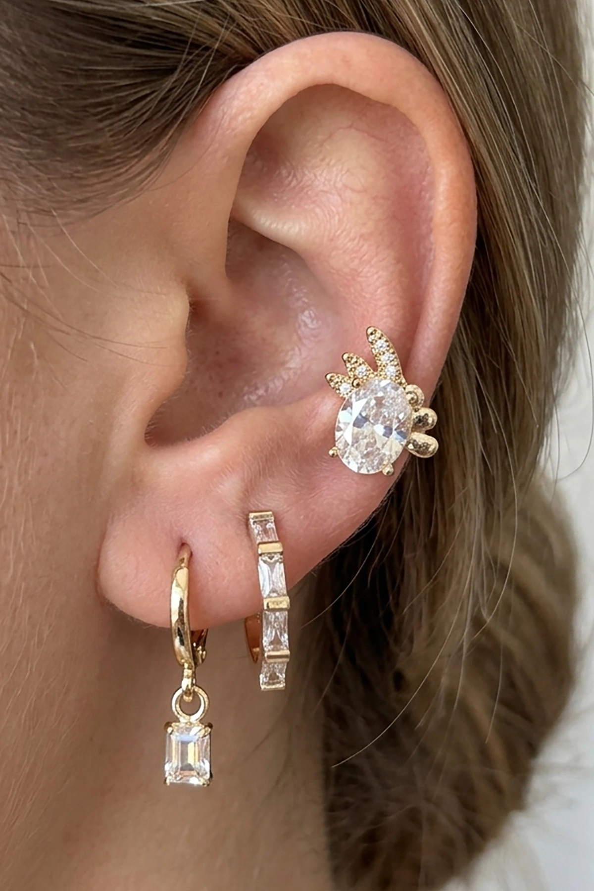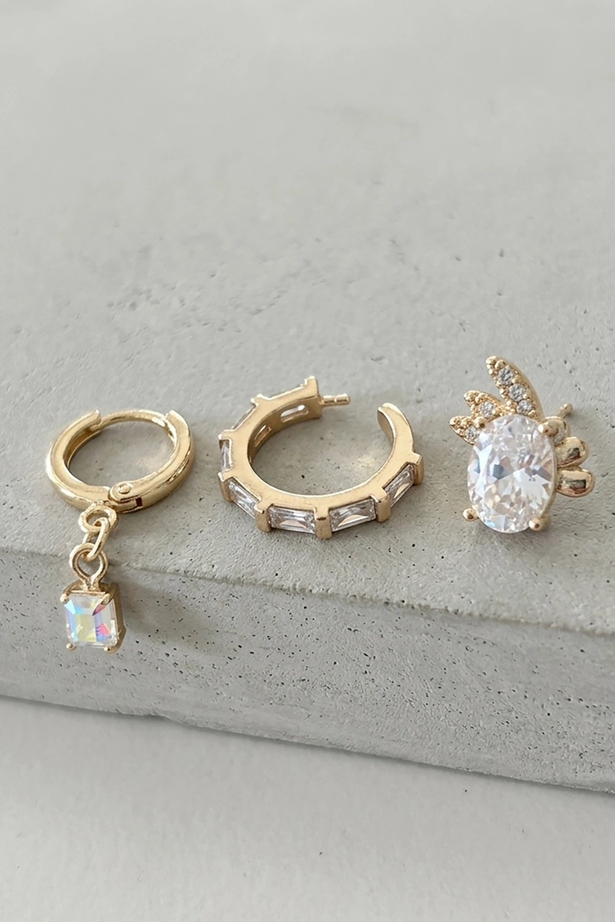 Altın Renk Taş Detaylı 3'lü YSX Küpe Set