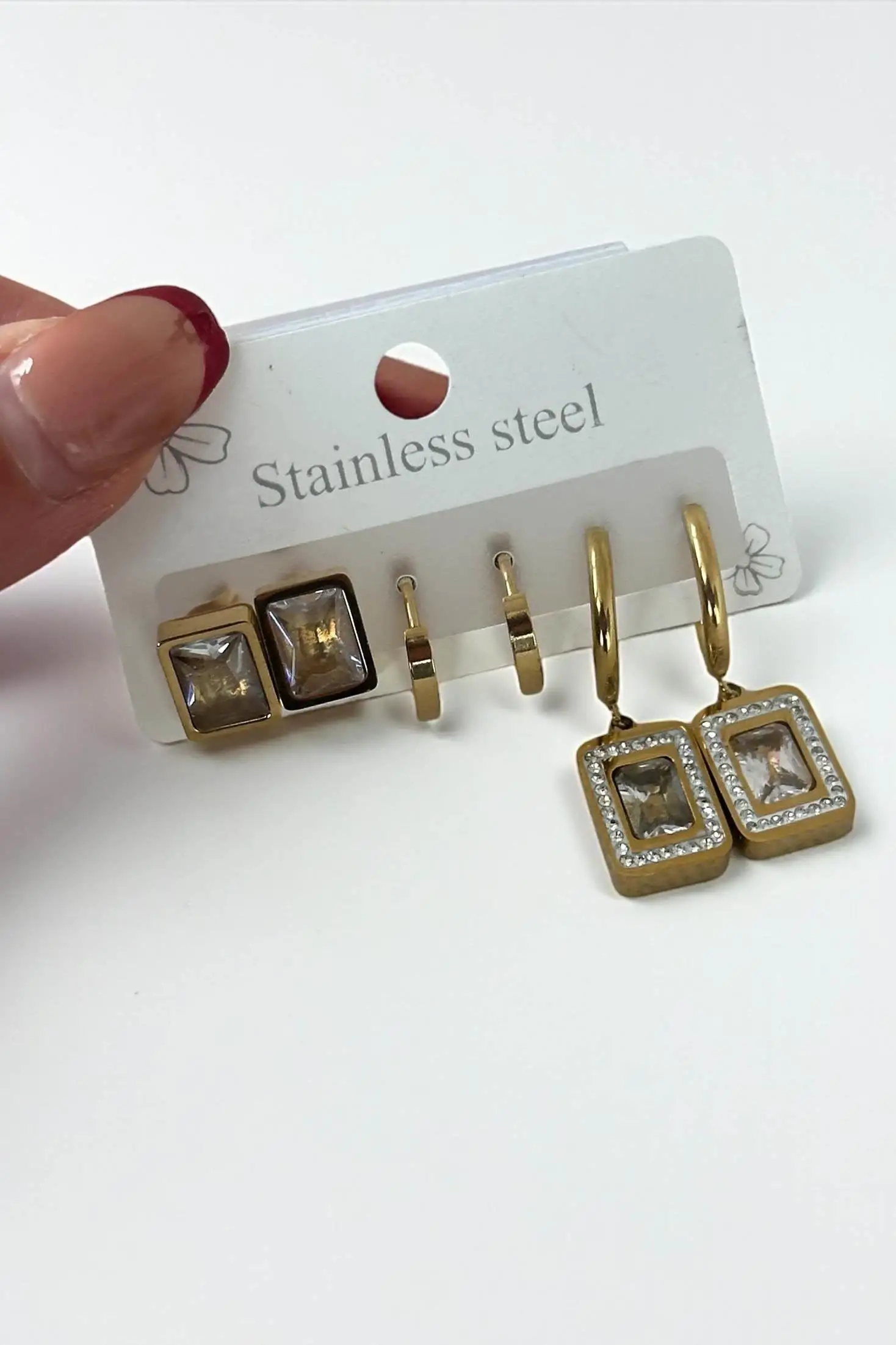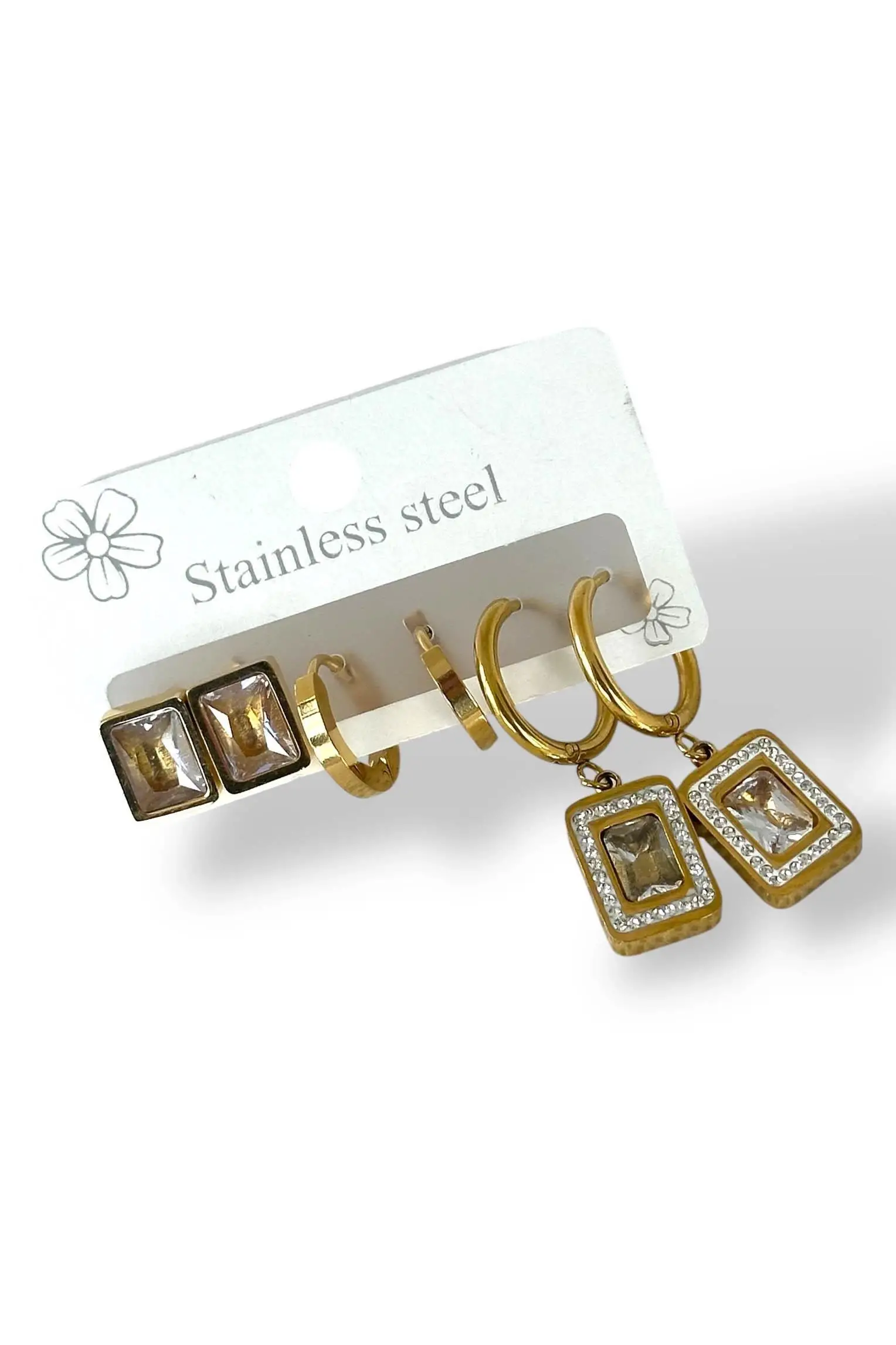 Altın Renk Taş Detaylı 6'lı Çelik Küpe Set