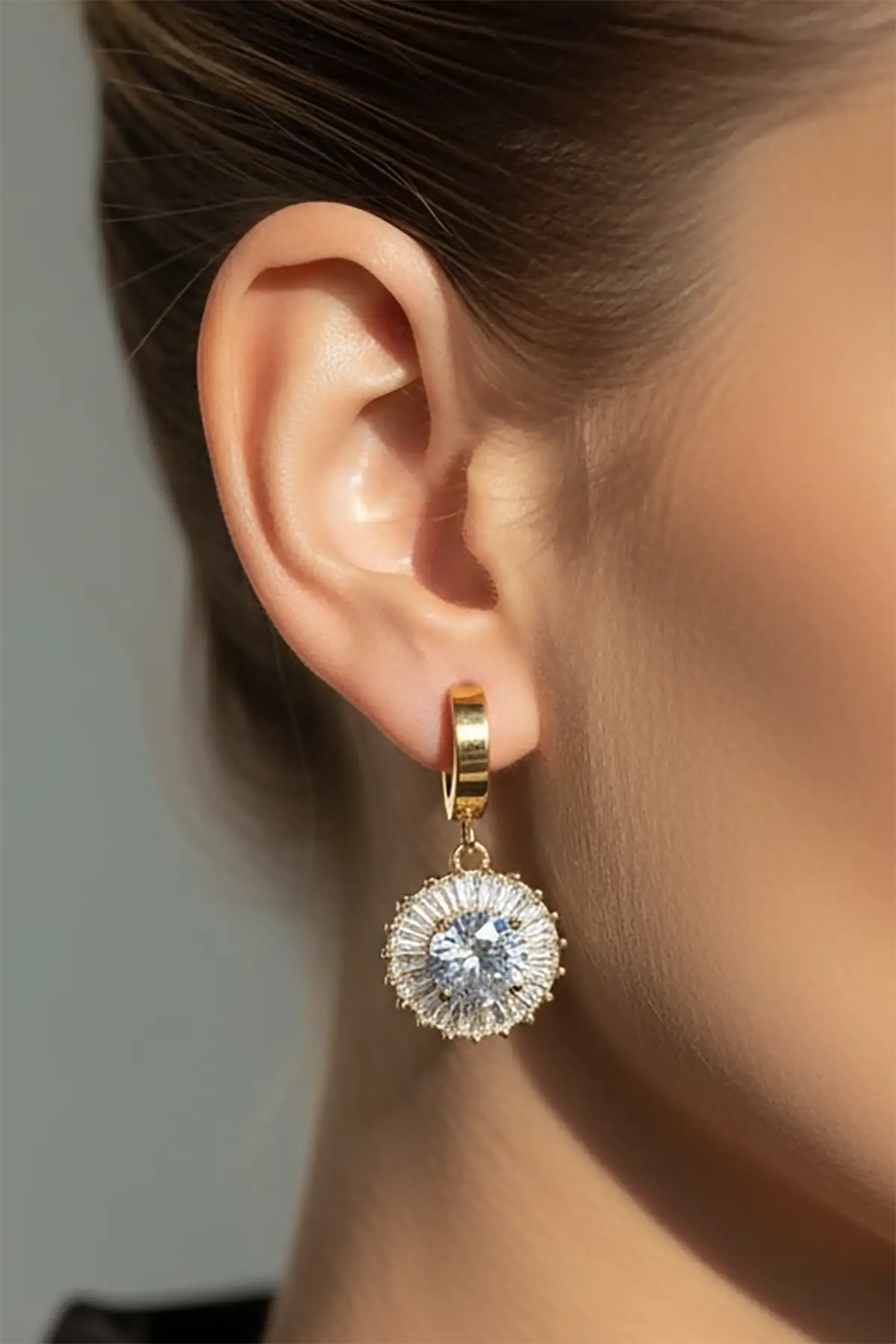 Altın Renk Taş Detaylı Sallantılı 14K Altın Kaplama Küpe (Çift)