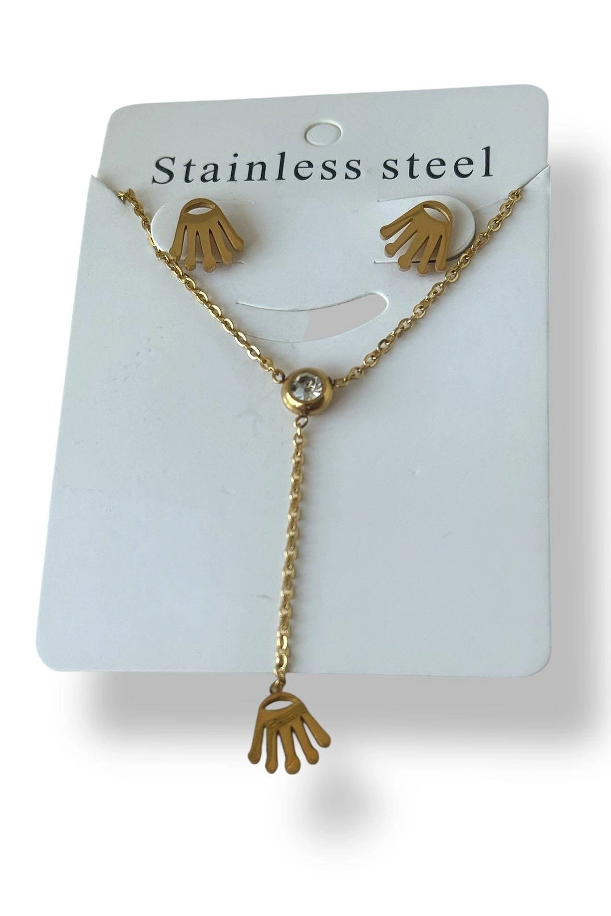 Altın Renk Taş Detaylı Çelik Küpe Kolye Set