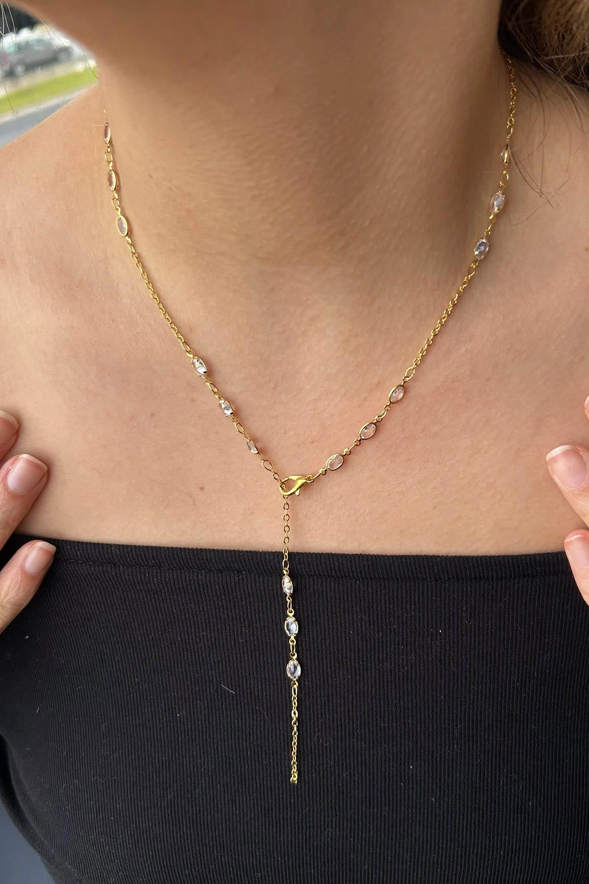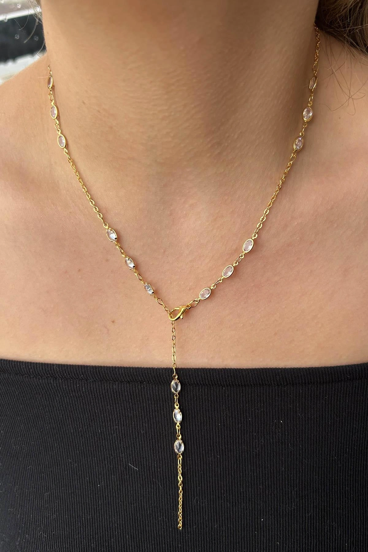 Altın Renk Taş Detaylı Çelik Y Kolye