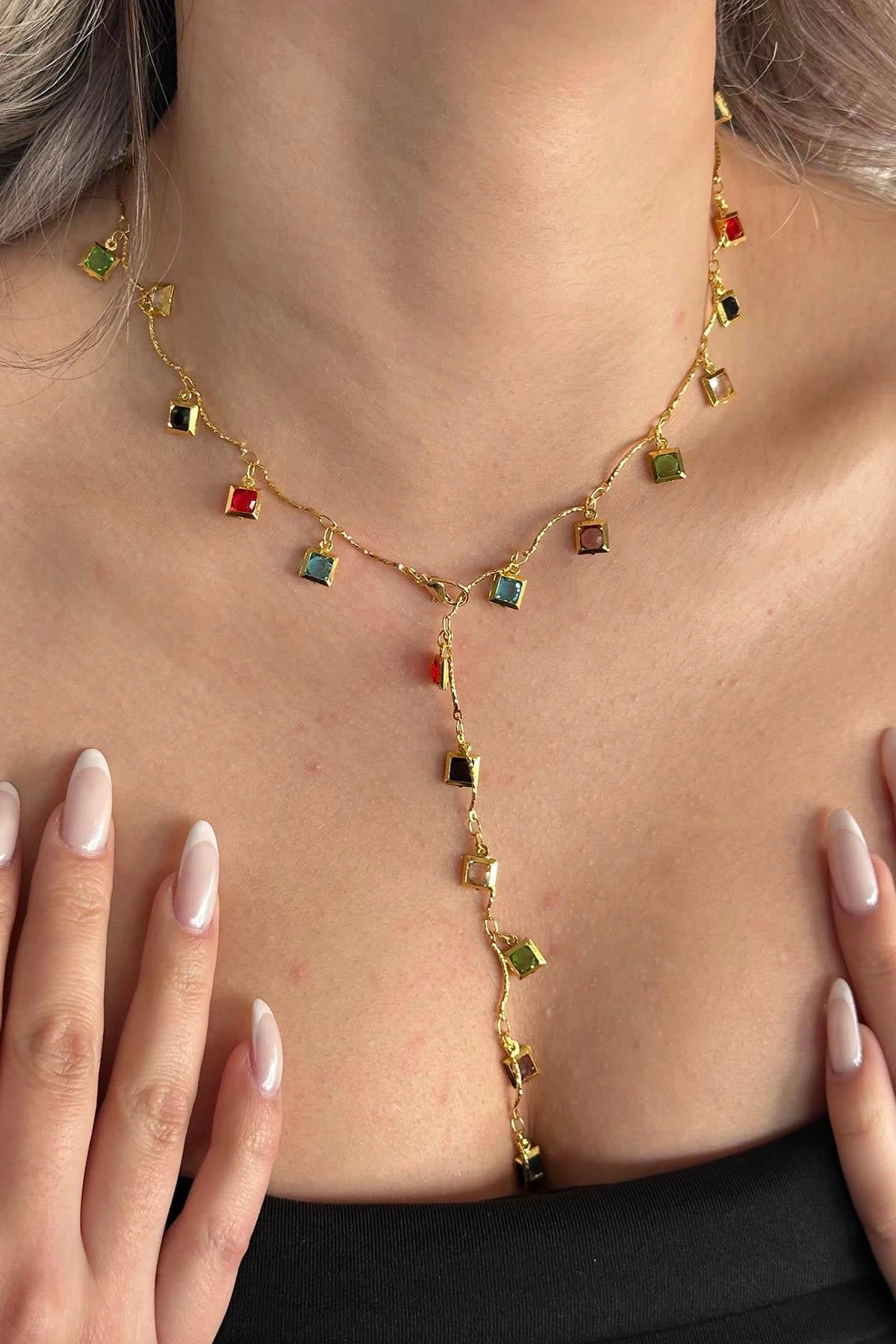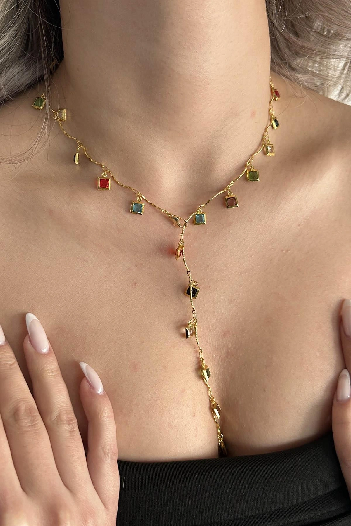 Altın Renk Taş Detaylı Çelik Y Kolye