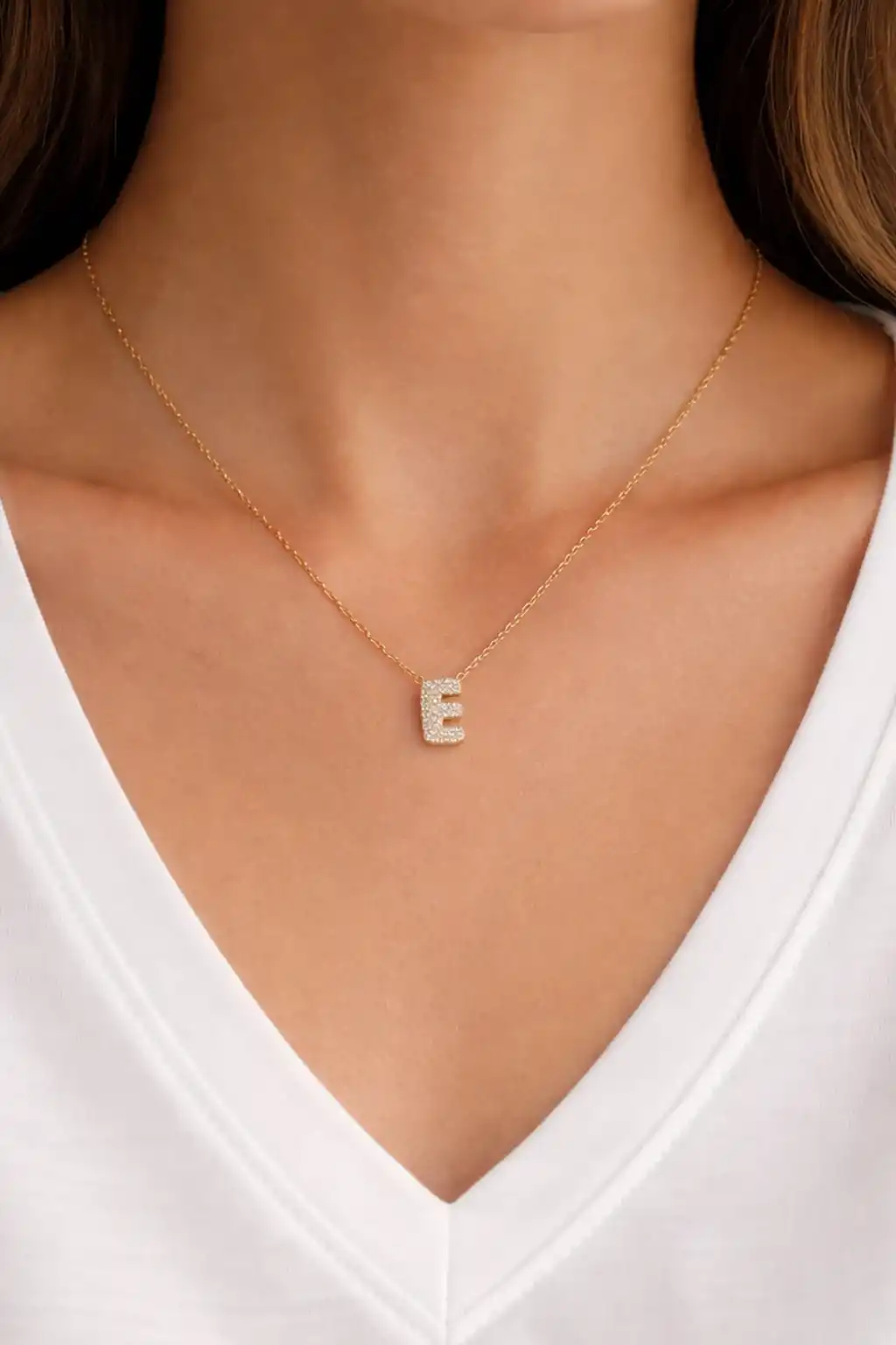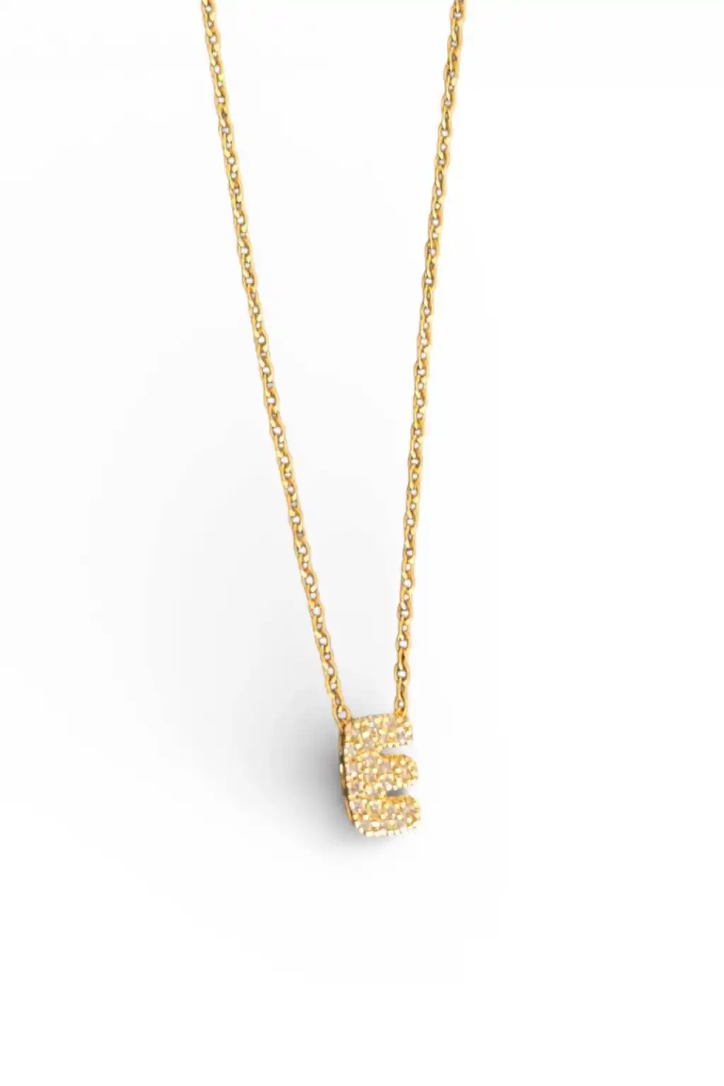 Altın Renk Taş Detaylı E Harfli Mini Çelik Kolye