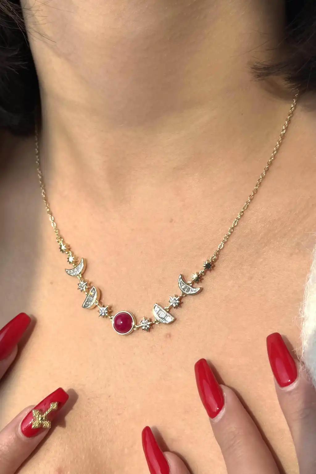 Gümüş Renk Kırmızı Taş Detaylı Tasarım Abiye Kolye