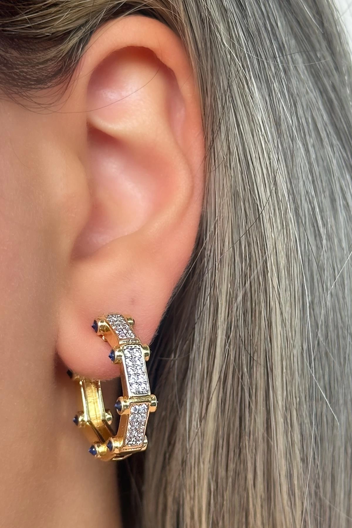 - Zarif tasarımıyla dikkat çeken bu çift küpe, detaylarıyla göz alıcı bir görünüm sunar.