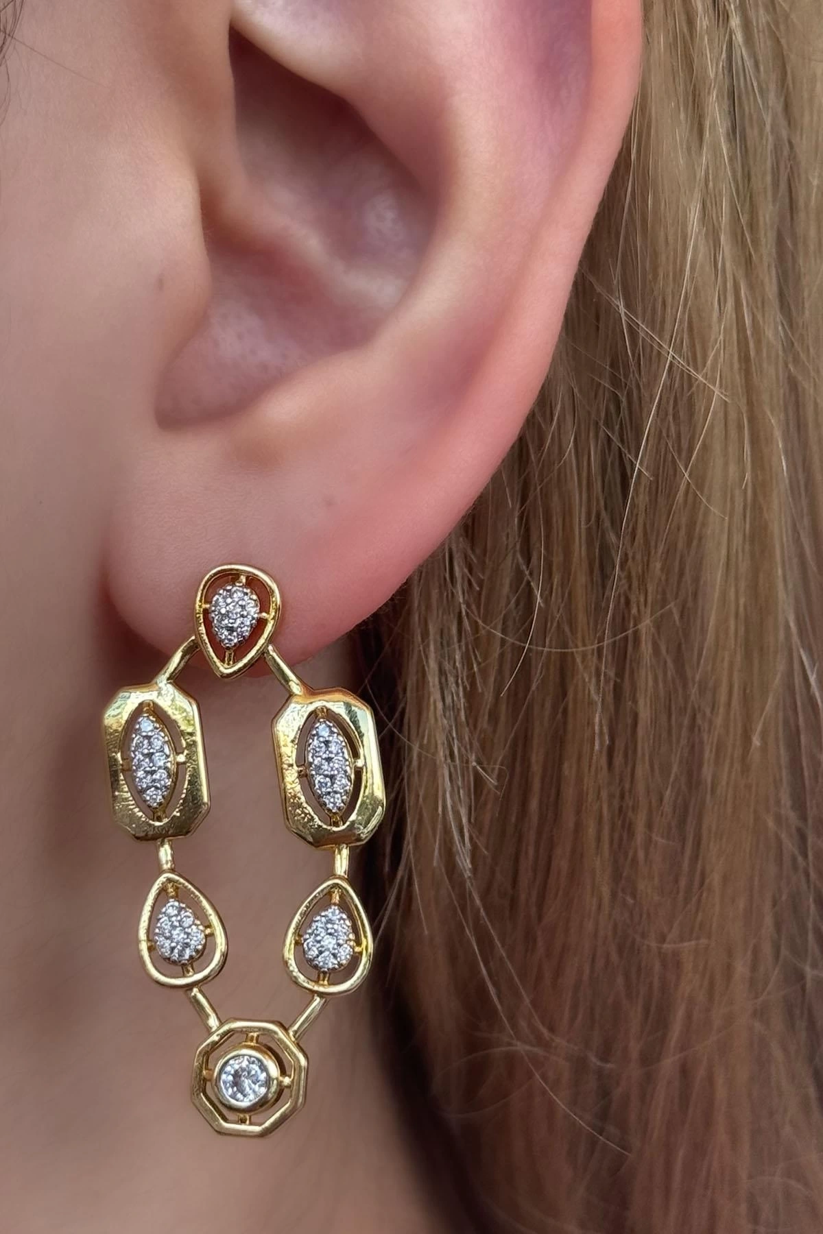 - Zarif tasarımıyla dikkat çeken bu çift küpe, detaylarıyla göz alıcı bir görünüm sunar.