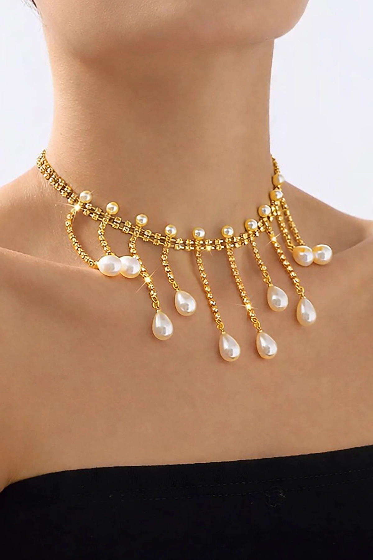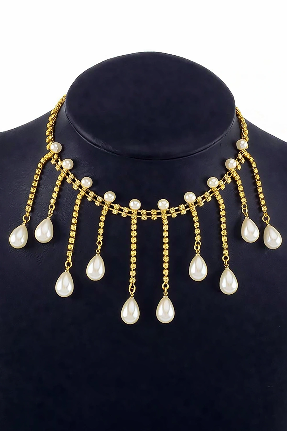 Altın Renk Taş Ve İnci Detaylı Tasarım Abiye Kolye