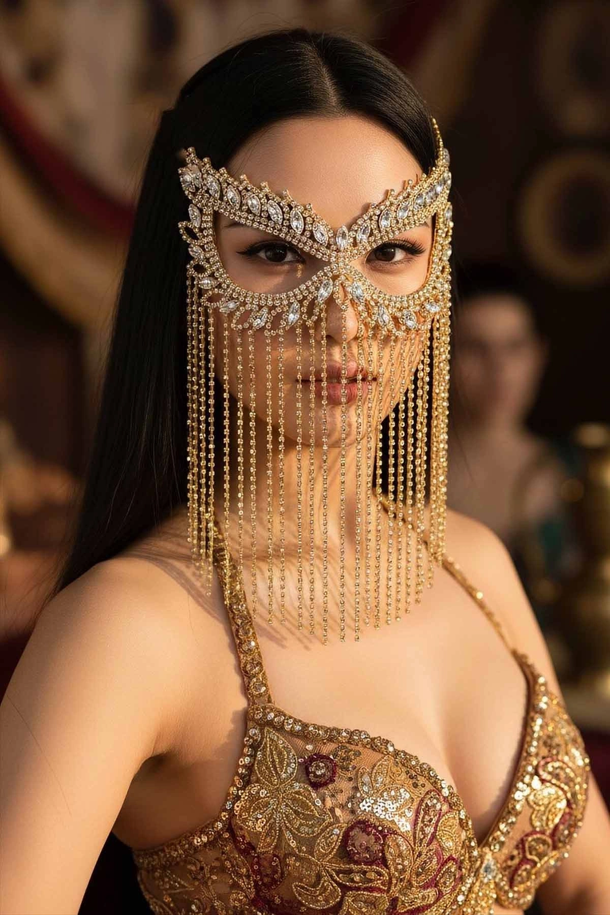 Bu taşlı yüz party maskesi, parti gecelerinde parıltınızı ve çekiciliğinizi artırmak için tasarlanmıştır. Zarif taş detayları ile süslenmiş olan bu maskenin altındaki yüzünüz, partinin en göz alıcı görüneni olacak.