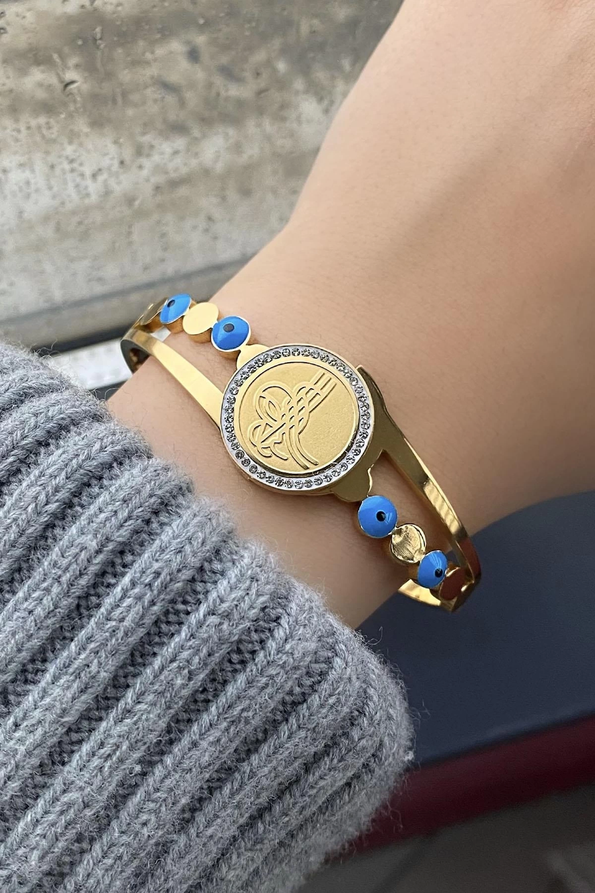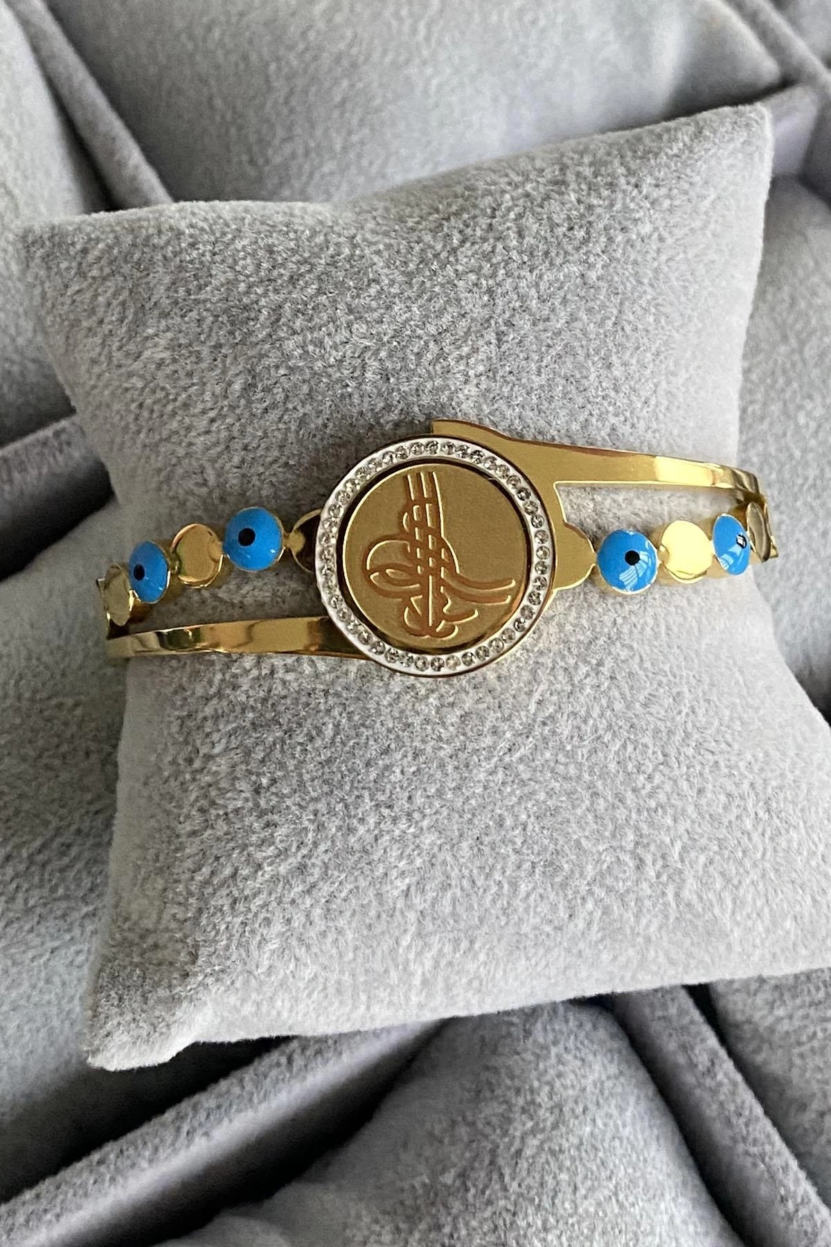 Altın Renk Göz Figürlü Taş Detaylı Çelik Kelepçe Bileklik