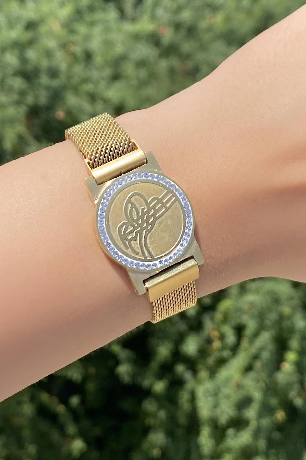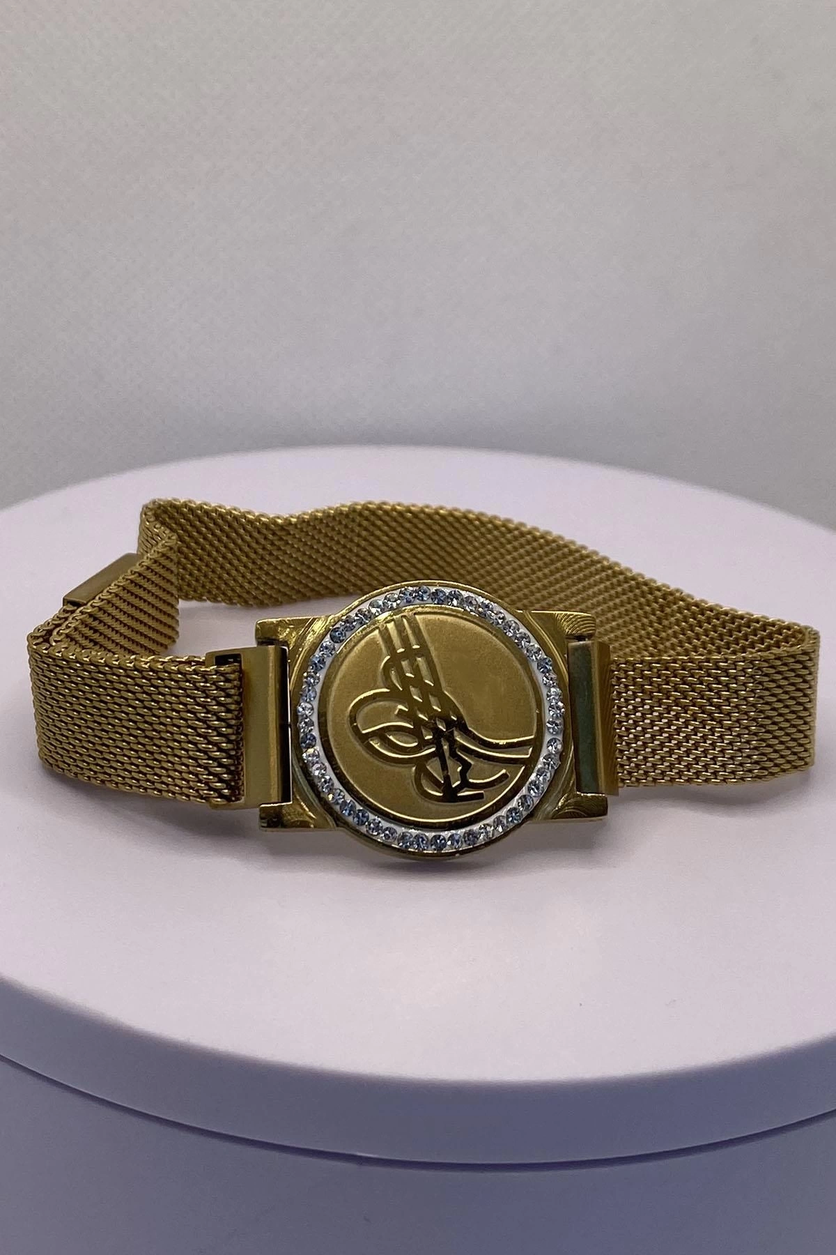 Altın Renk Tuğra Figürlü Hasır Kordonlu Çelik Bileklik