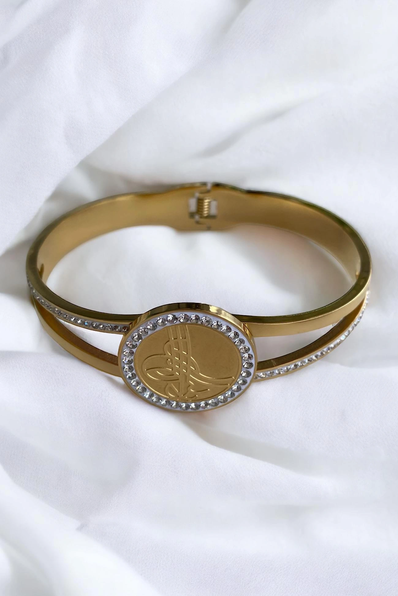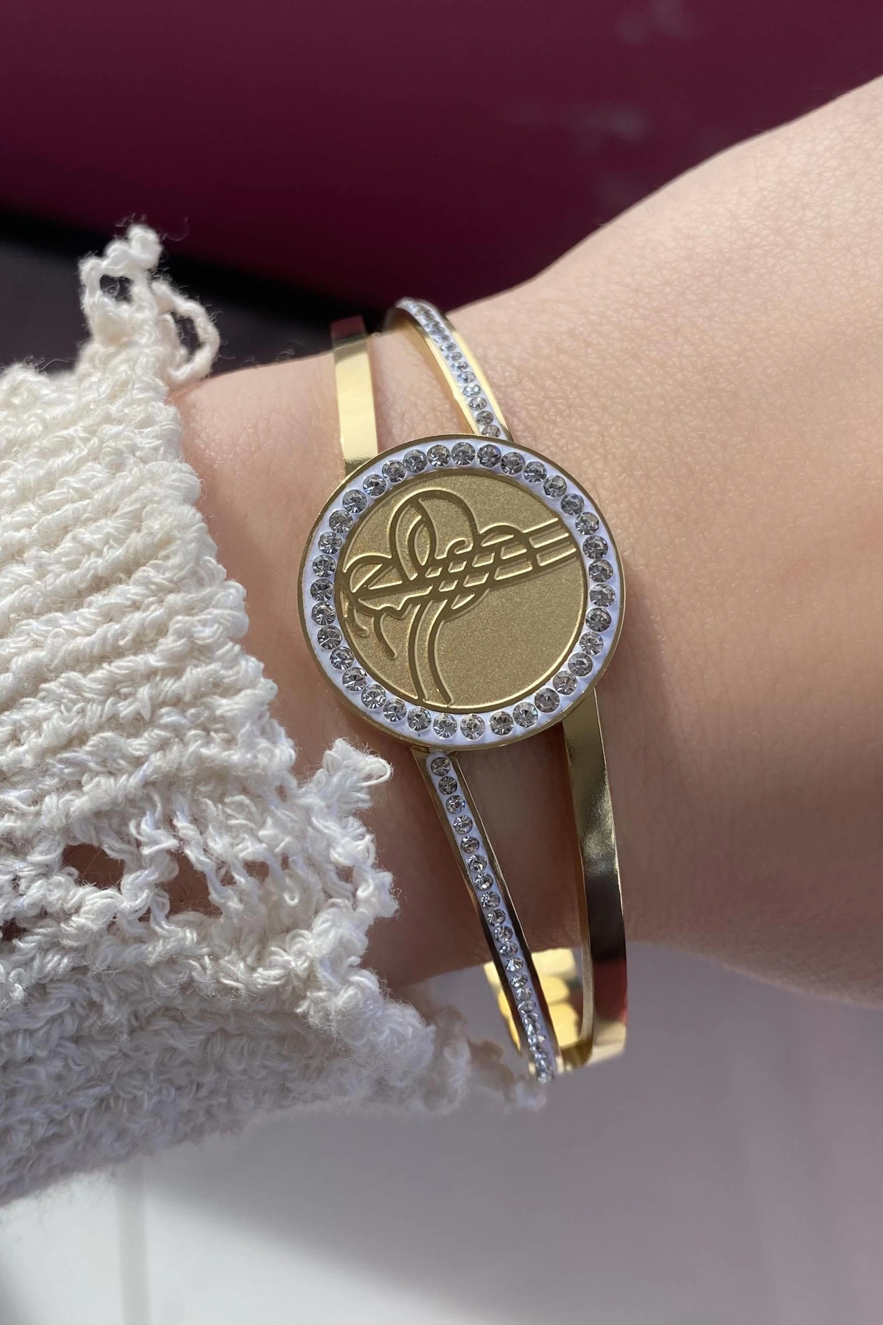 Altın Renk Tuğra Figürlü Taşlı Çelik Bileklik