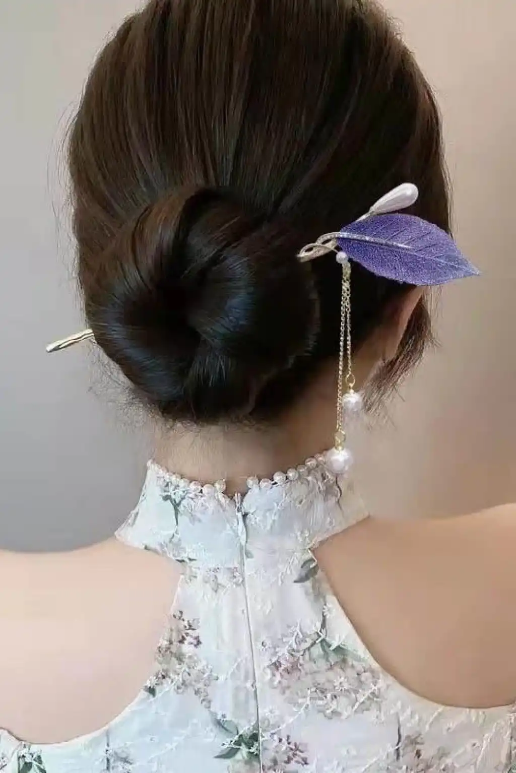 Altın Renk Yaprak Figürlü İnci Detaylı Topuz Tokası