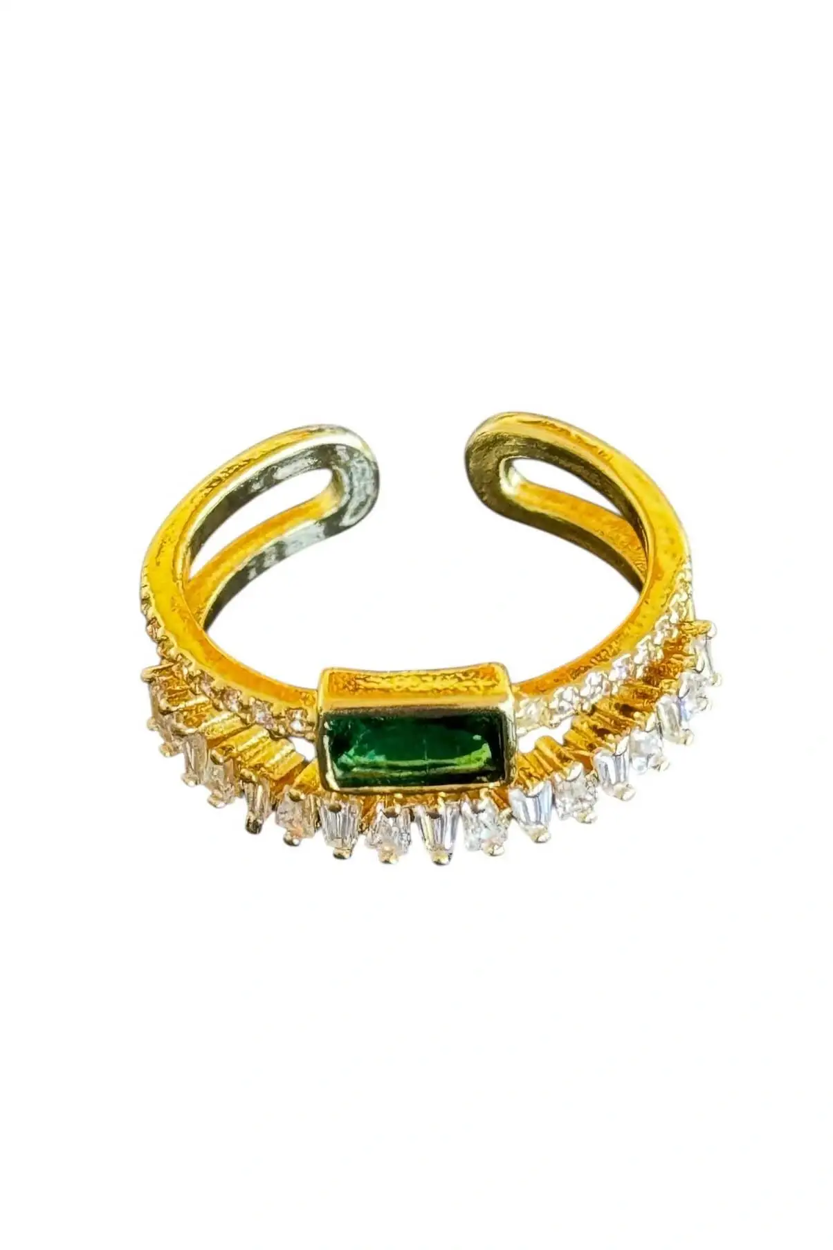 Altın Renk Yeşil Taş Detaylı Ayarlanabilir Çelik Yüzük