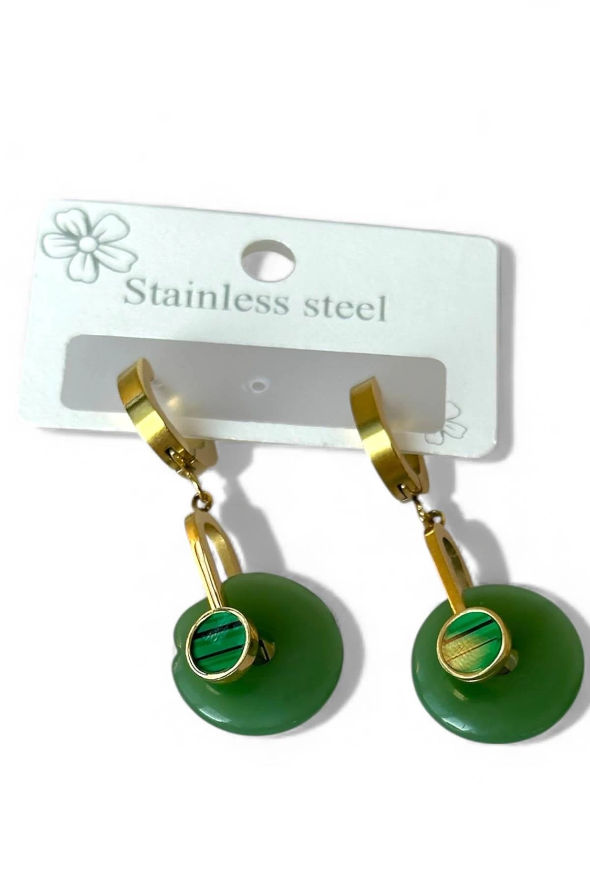 Altın Renk Yeşil Taş Detaylı Çelik Küpe (Çift)