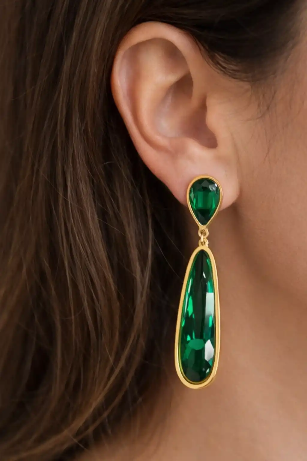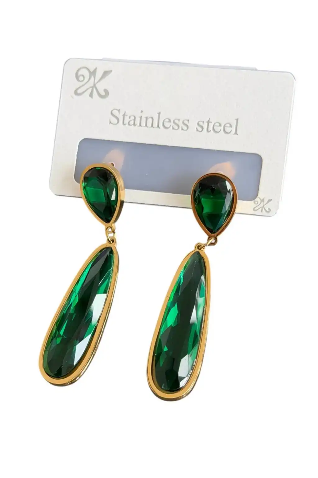 Altın Renk Yeşil Taş Detaylı Çelik Küpe (Çift)