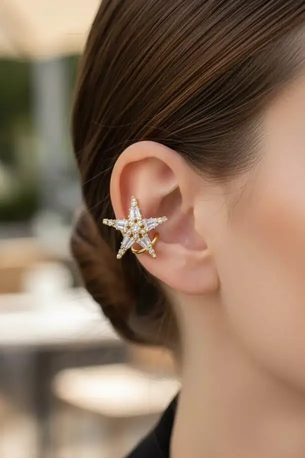 Zarif yıldız figürü ve ışıltılı taş detaylarıyla öne çıkan 14K altın kaplama ear cuff, kulağınıza şıklık katmanın en modern yollarından biri. Delik gerektirmeyen tasarımı sayesinde kolayca takılır ve gün boyu konforlu kullanım sunar. Tek başına kullanıldığında bile güçlü bir stil vurgusu yapar, diğer küpelerle kombinlendiğinde ise trend bir görünüm oluşturur.