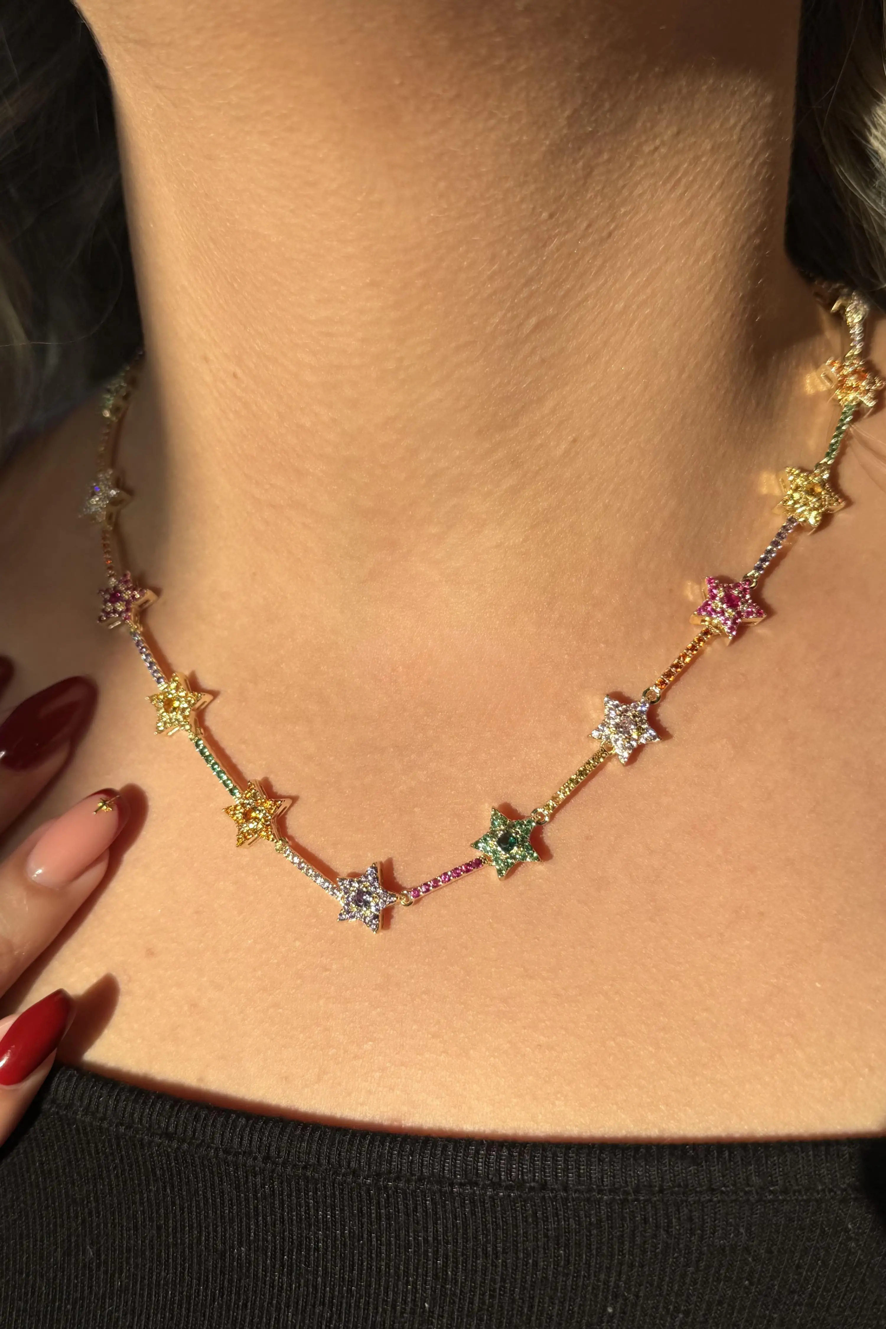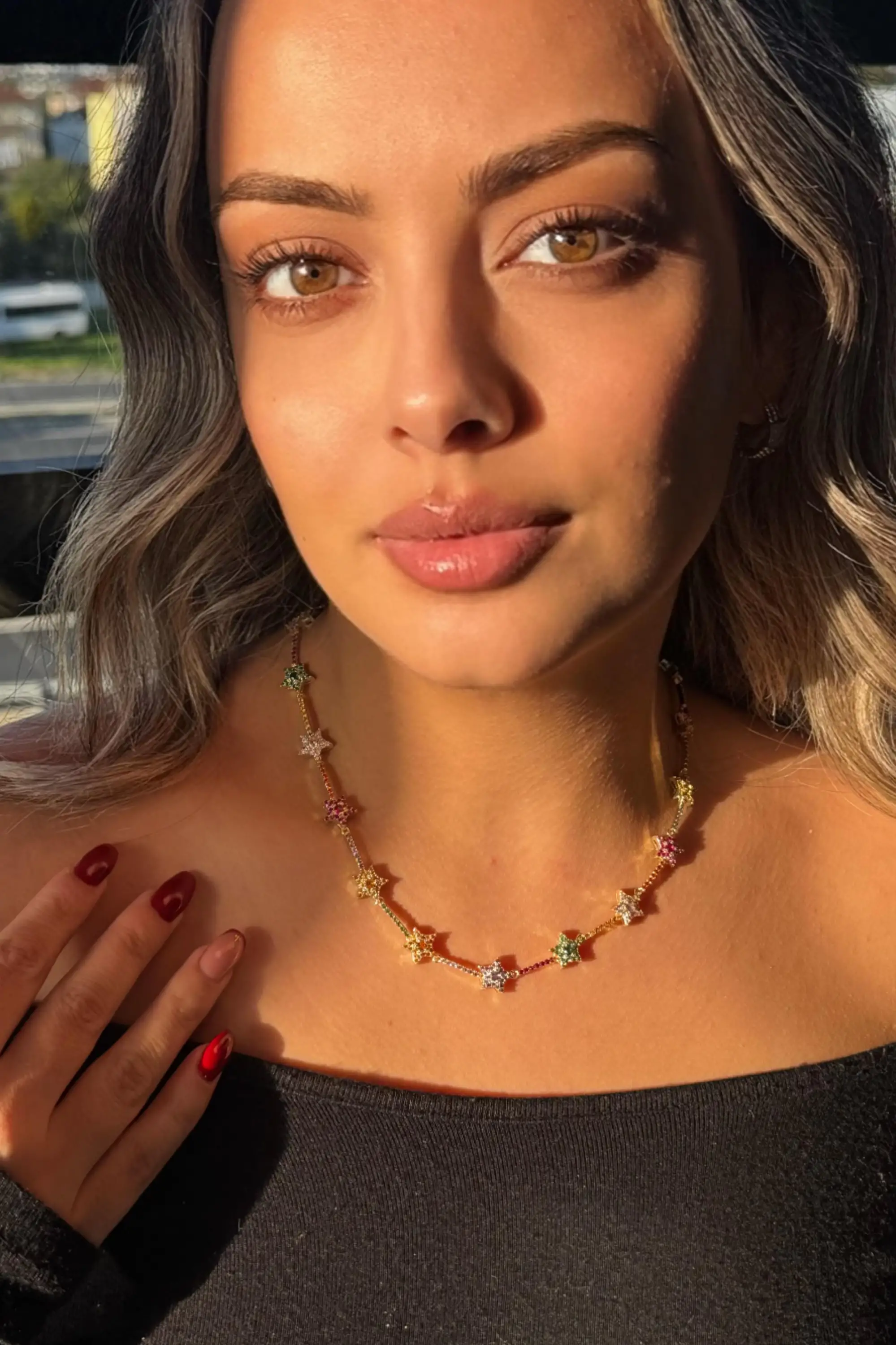Altın Renk Yıldız Figürlü Renkli Taş Detaylı Altın Kaplama VİP Kolye