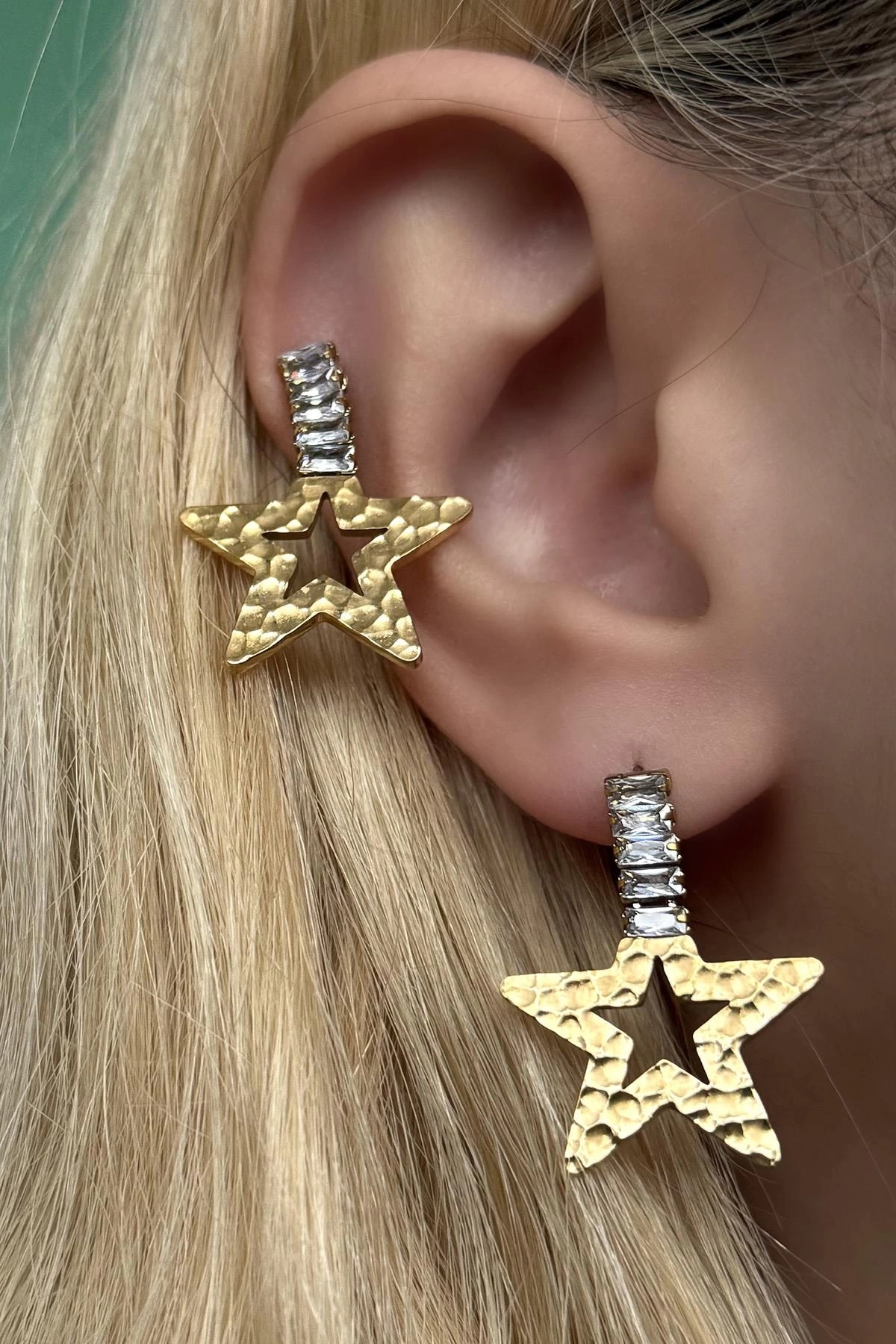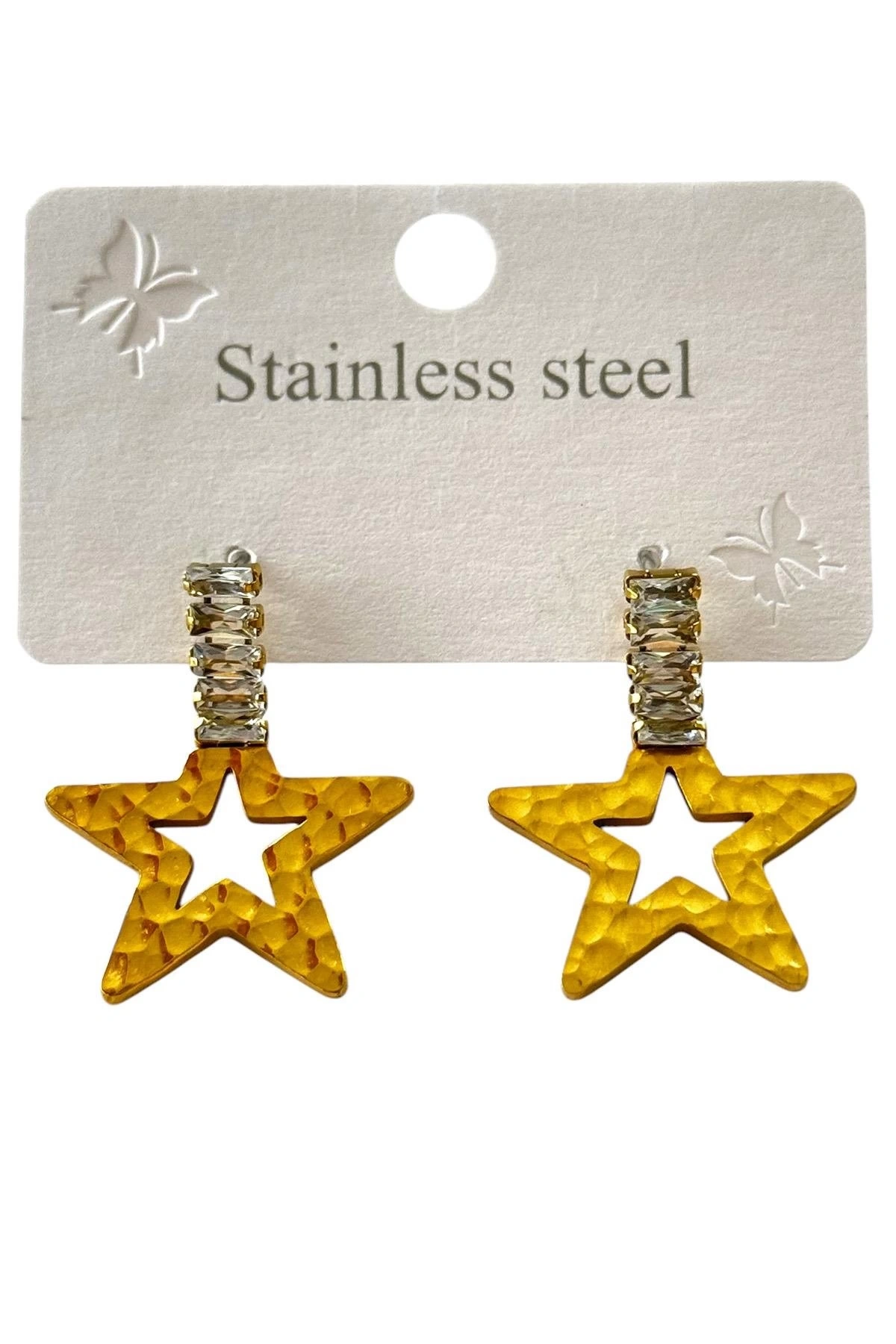 Altın Renk Yıldız Figürlü Taş Detaylı Çelik Küpe (Çift)