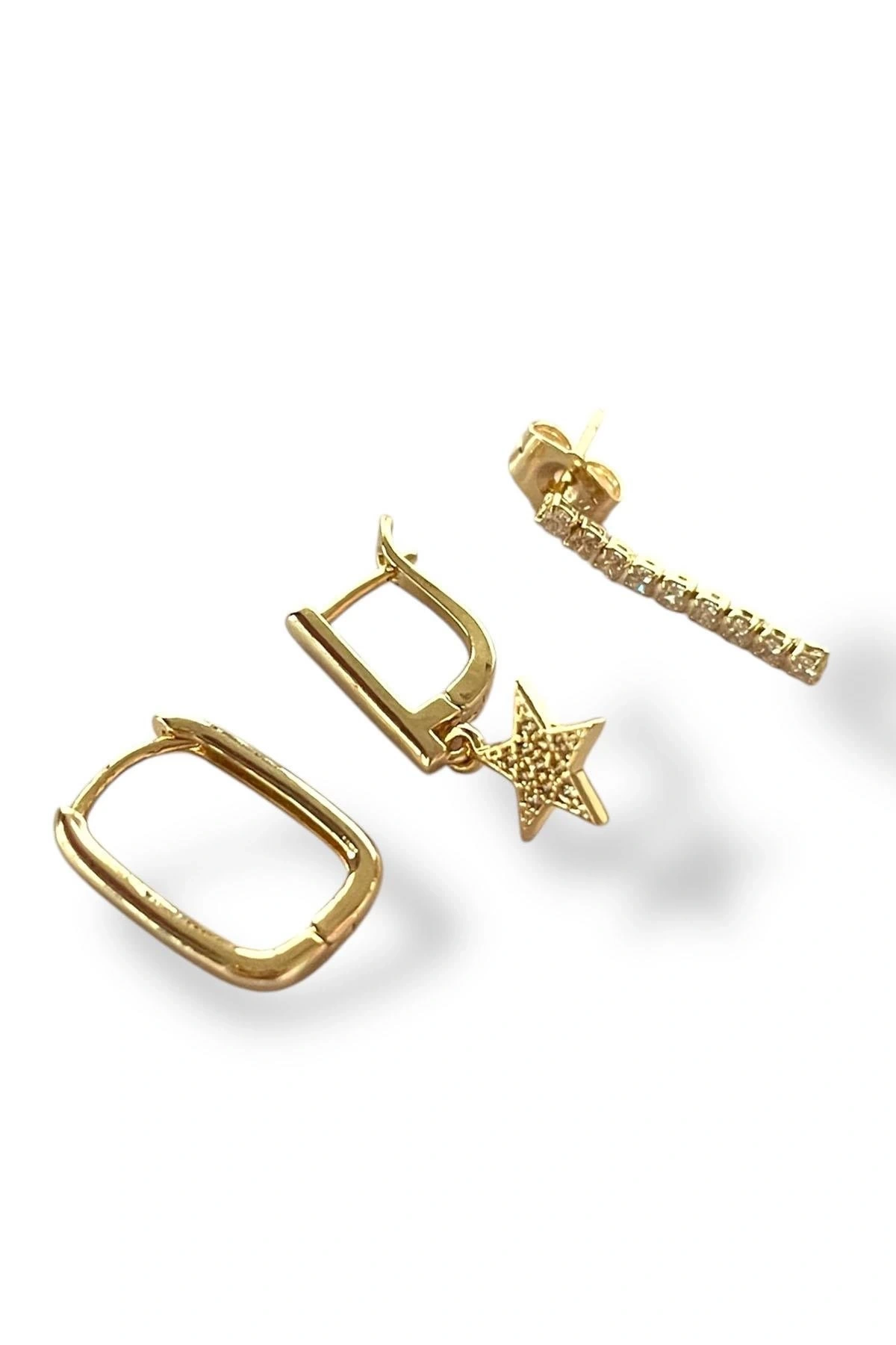 Altın Renk Yıldız Figürlü Taş Detaylı VİP 3'lü YSX Küpe Set