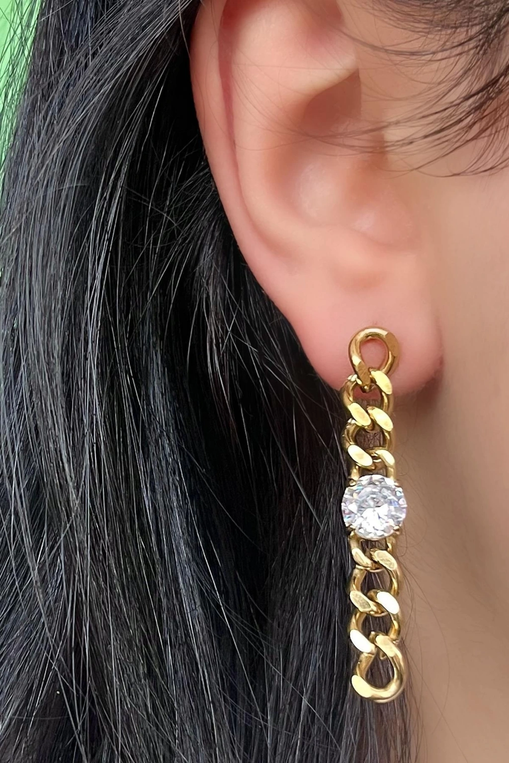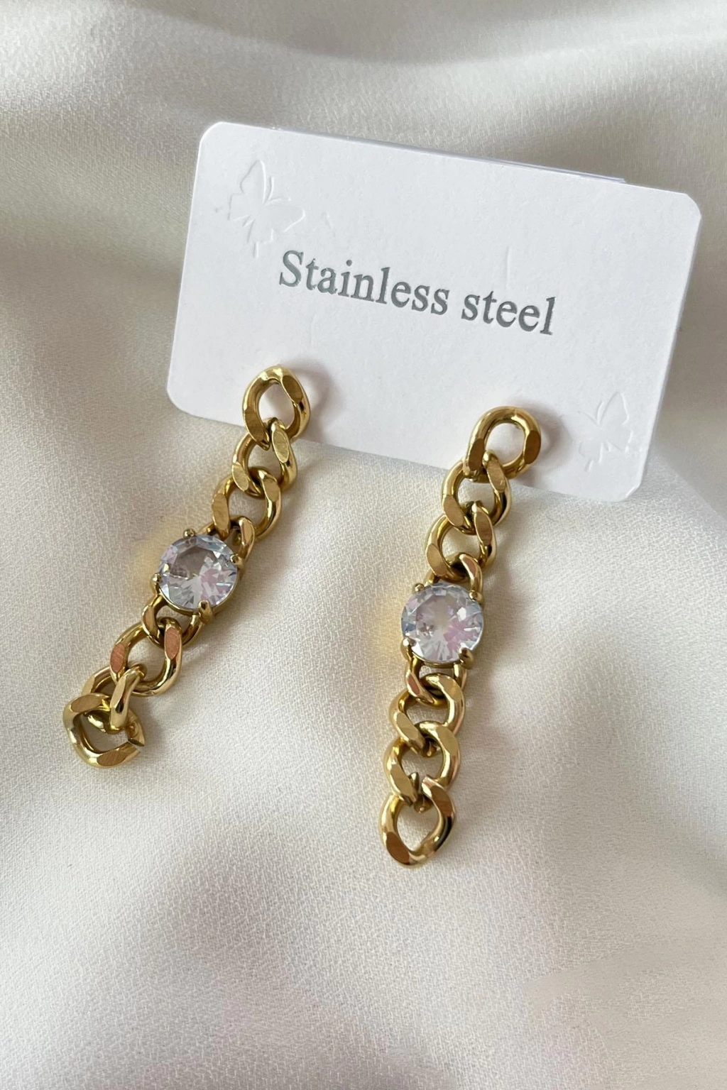 Altın Renk Zincir Figürlü Taş Detaylı Çelik Küpe (Çift)