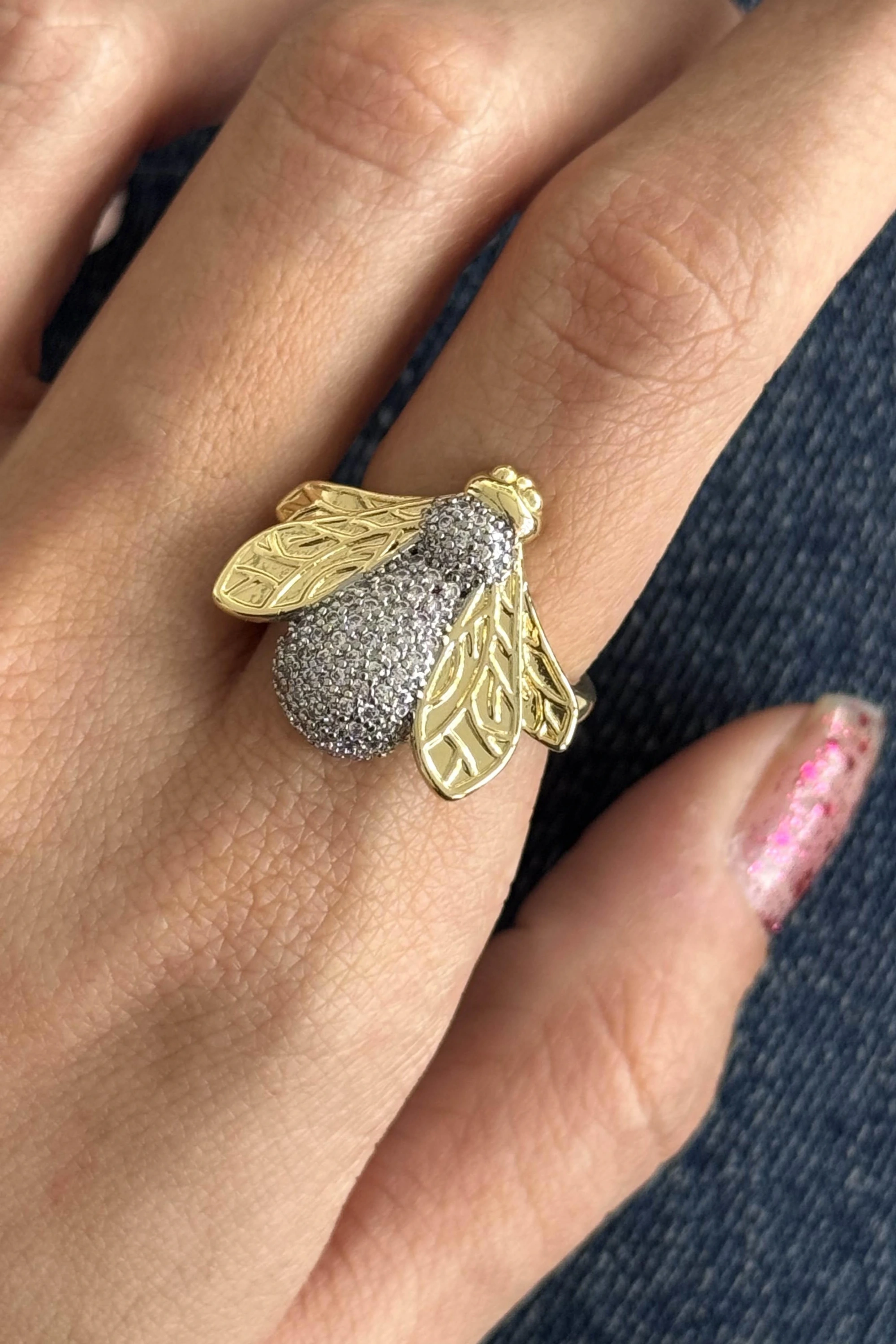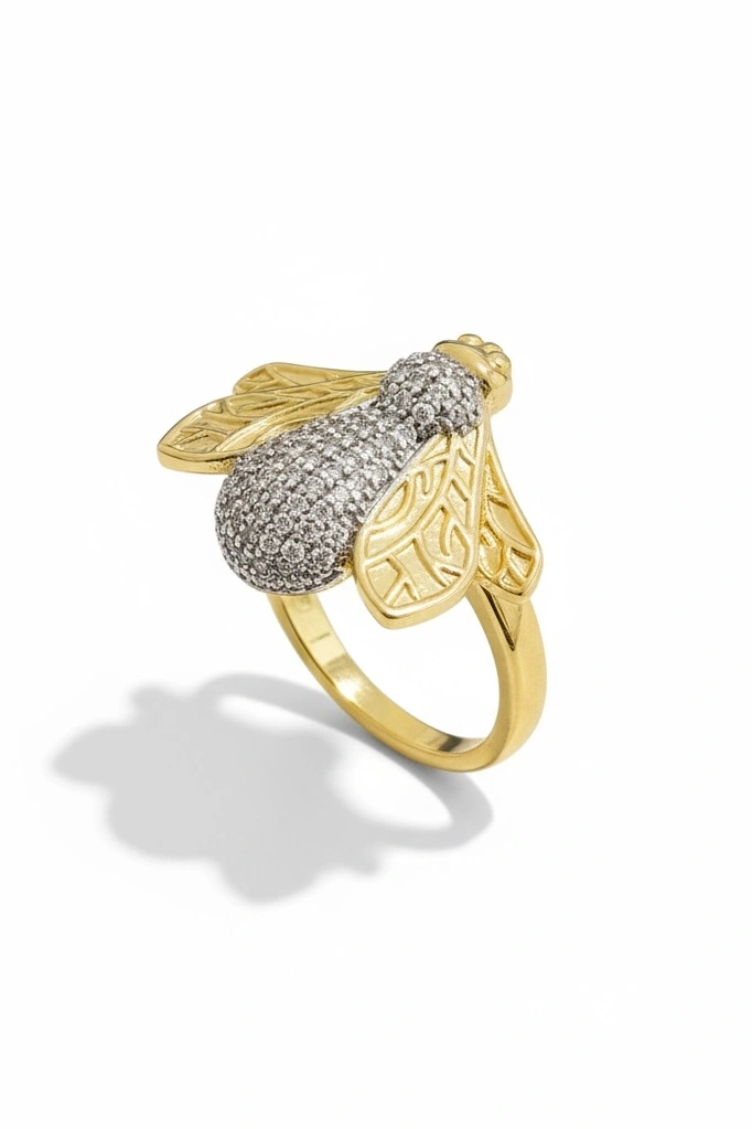 Altın Ve Gümüş Renk Arı Figürlü 14K Altın Kaplama Ayarlanabilir Yüzük