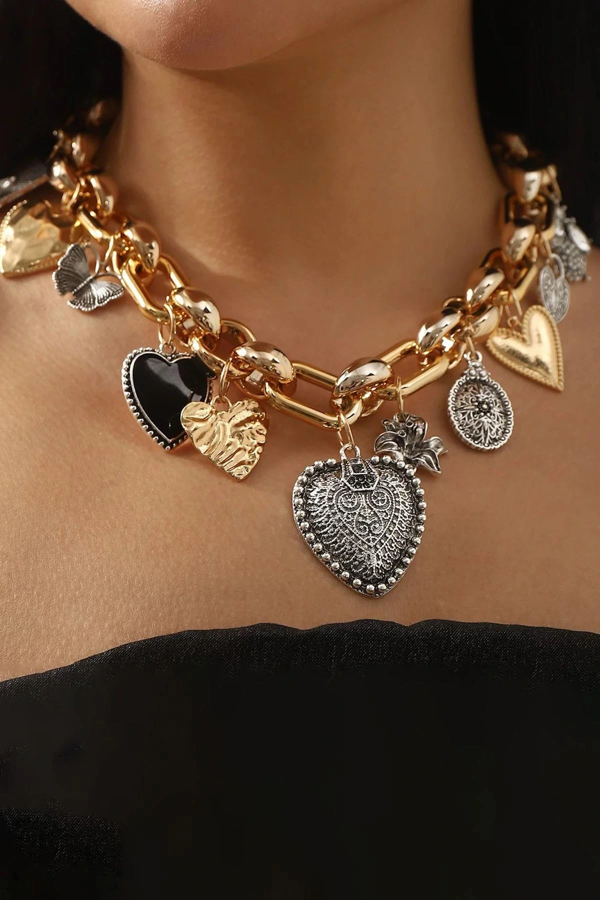 Altın Ve Gümüş Renk Charmlı Tasarım Kolye