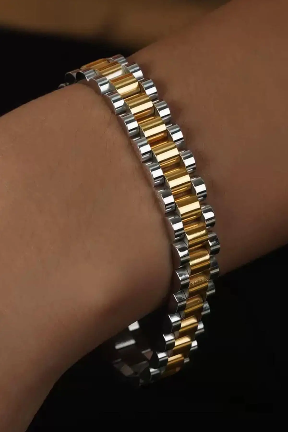 Altın Ve Gümüş Renk Zincir Detaylı Çelik Erkek Bileklik
