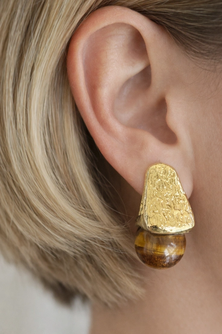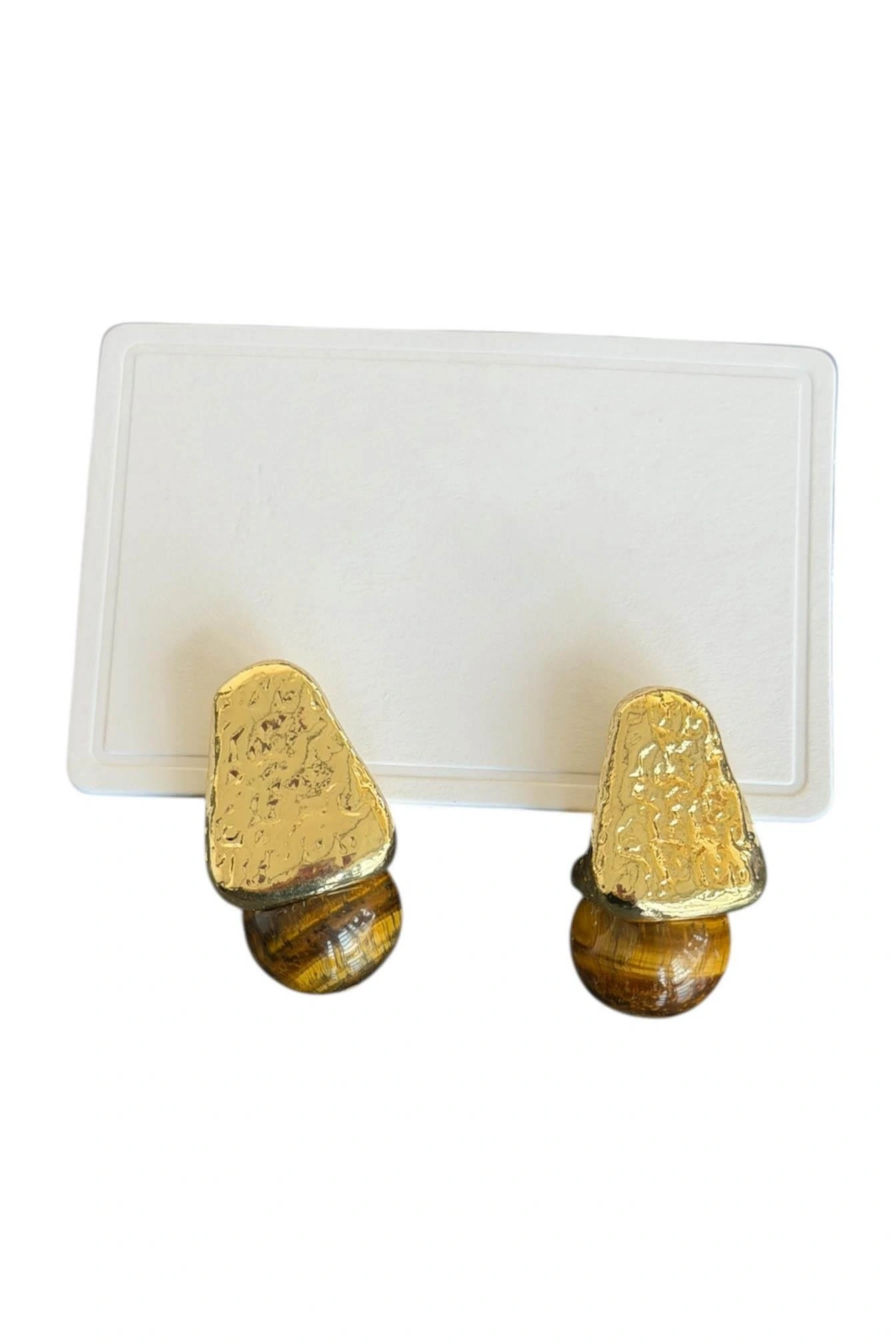 Altın Ve Kahve Renk Taş Detaylı Küpe (Çift)