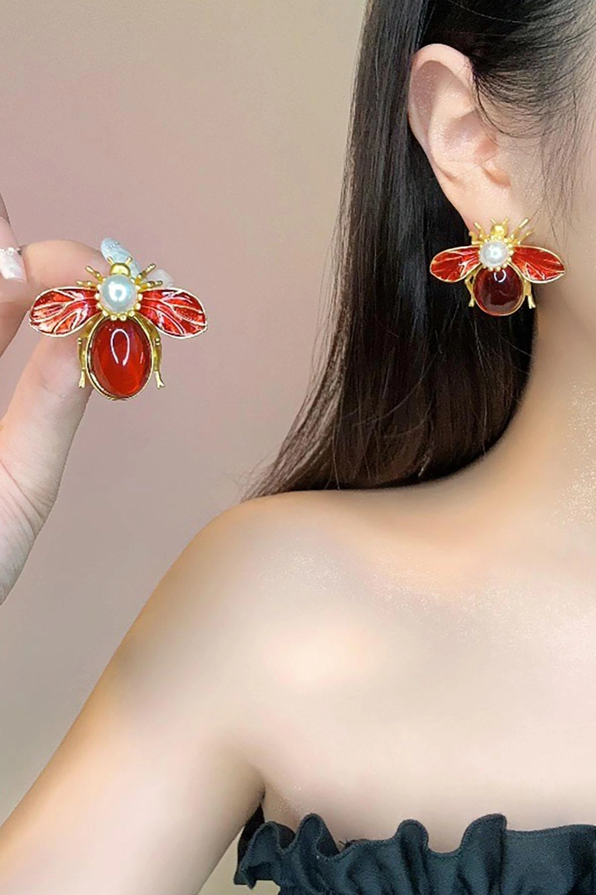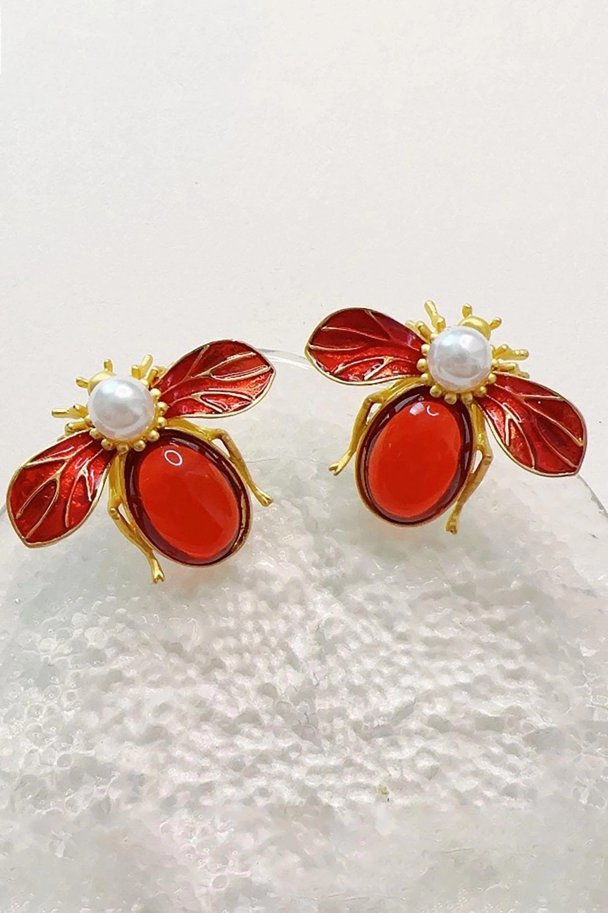 Altın Ve Kırmızı Renk Arı Figürlü Küpe (Çift)