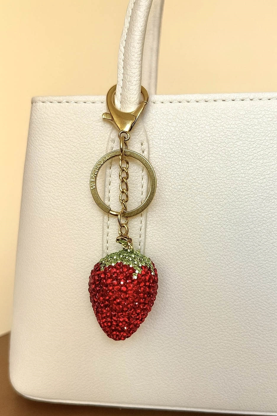 Altın Ve Kırmızı Renk Çilek Figürlü Taş Detaylı Çanta Charm/ Anahtarlık