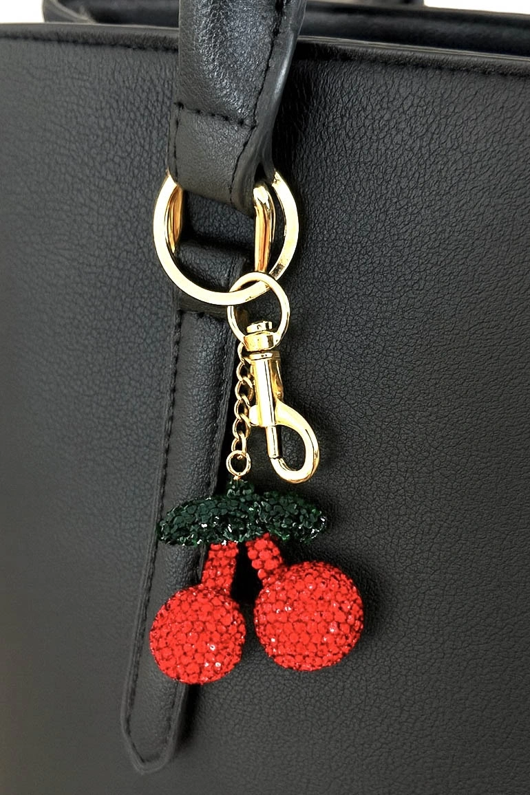 Altın Ve Kırmızı Renk Kiraz Figürlü Taş Detaylı Çanta Charm/ Anahtarlık