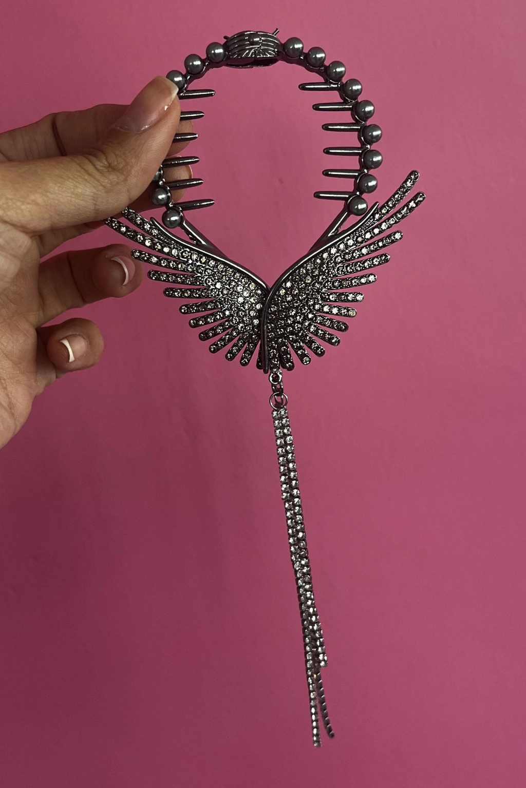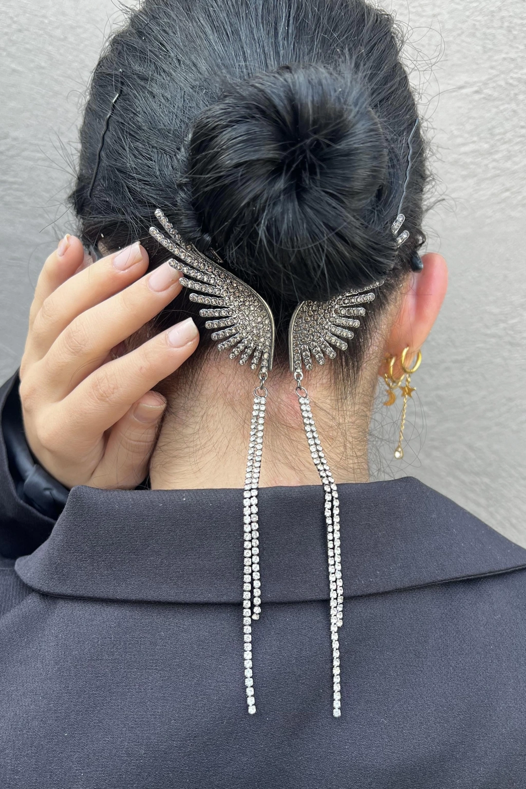 Antrasit Renk Melek Kanadı Figürlü İnci Ve Taş Detaylı Topuz Toka