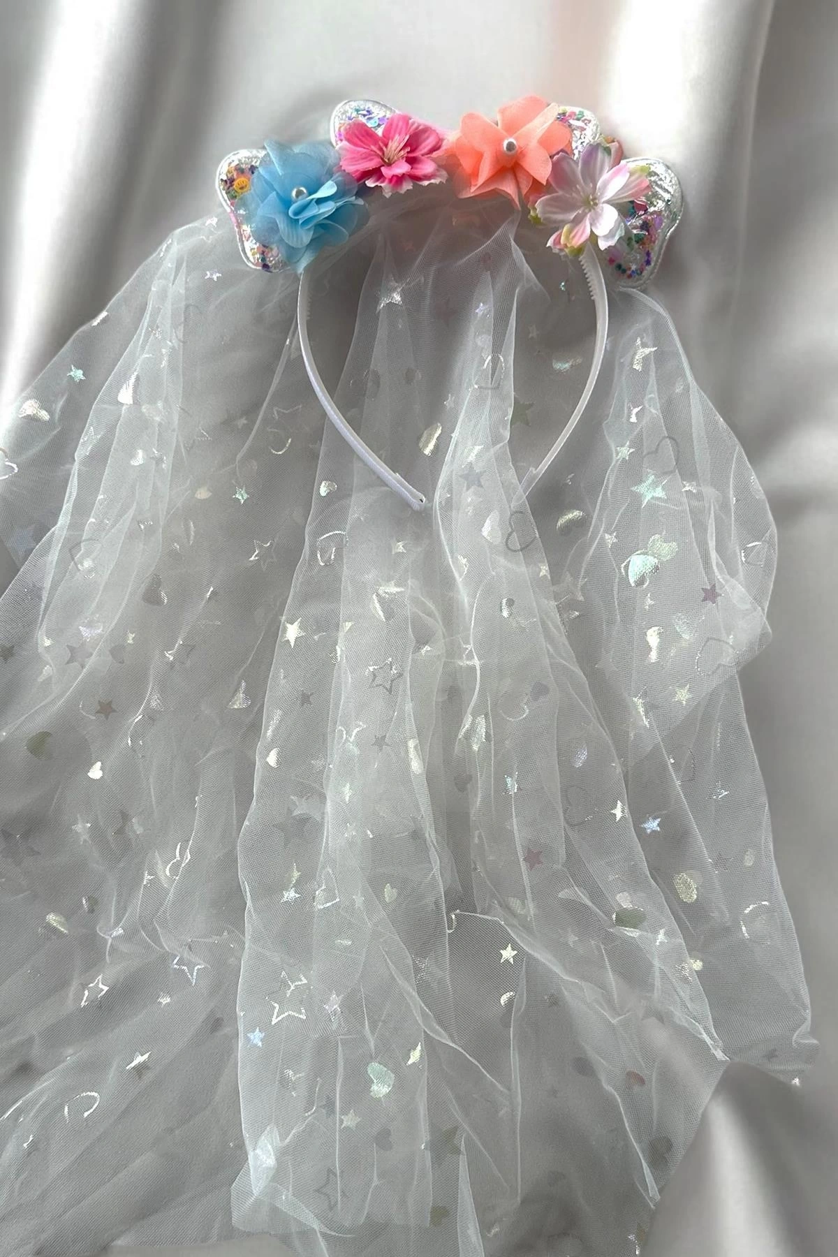 Beyaz Renk Çiçek Figürlü Tül Detaylı Taç