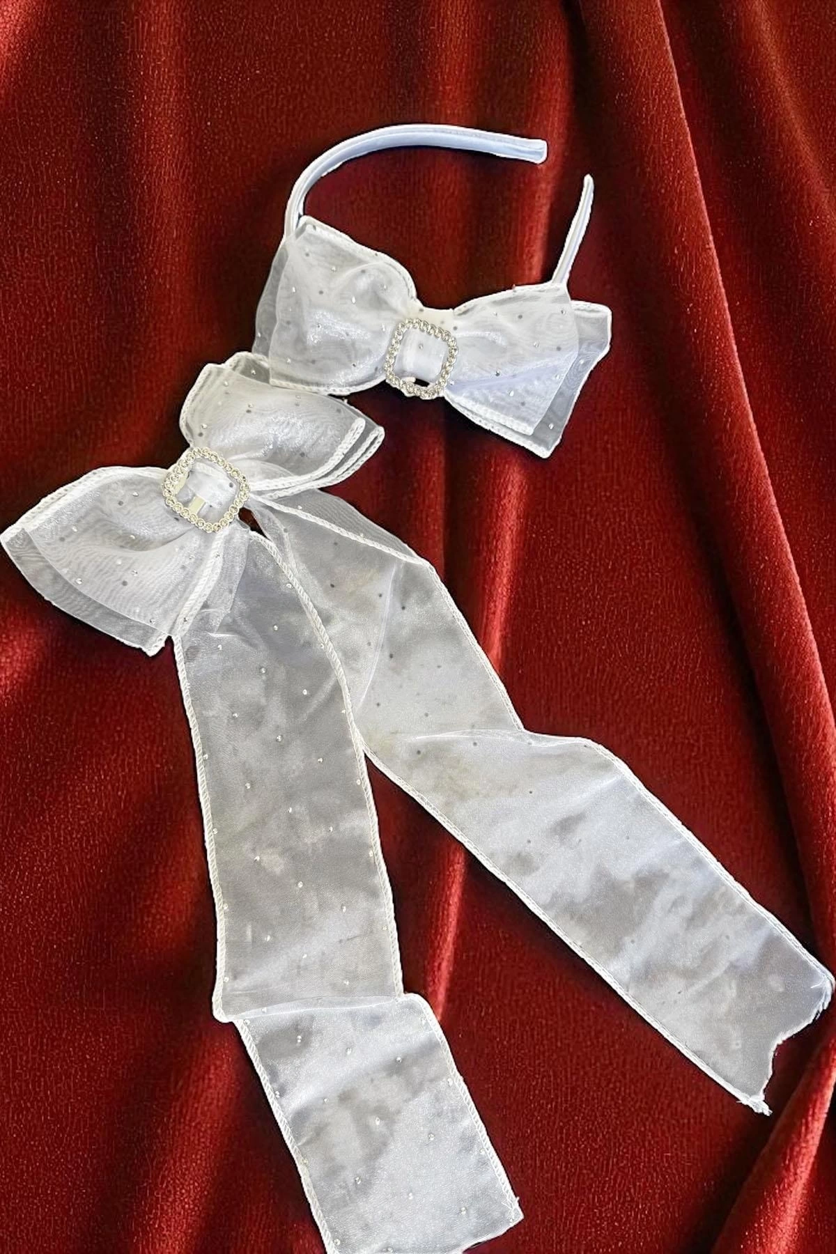 Beyaz Renk Taş Detaylı Otomat Toka Ve Taç Set