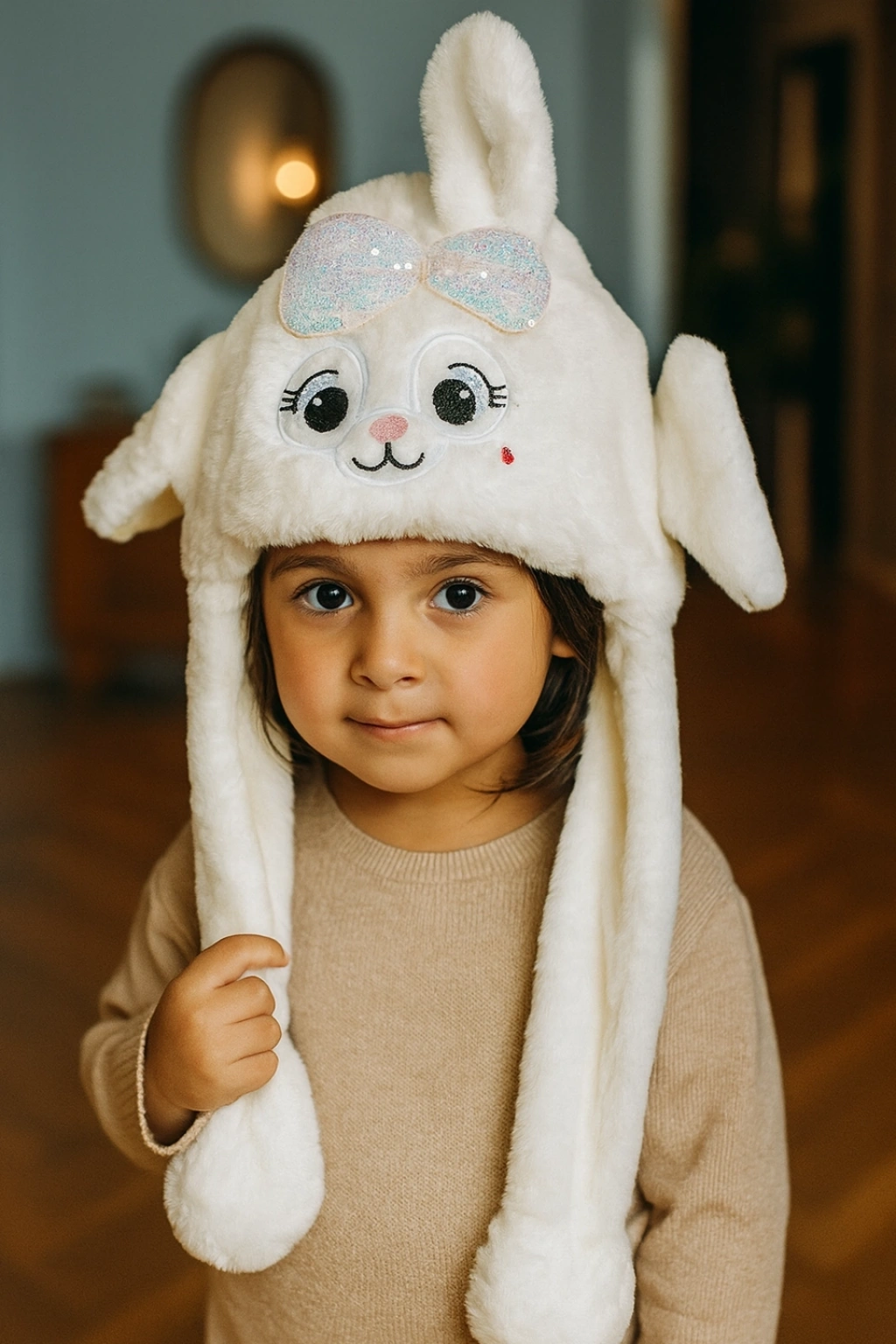 Beyaz Renk Tavşan Figürlü Kulakları Oynayan Peluş Şapka