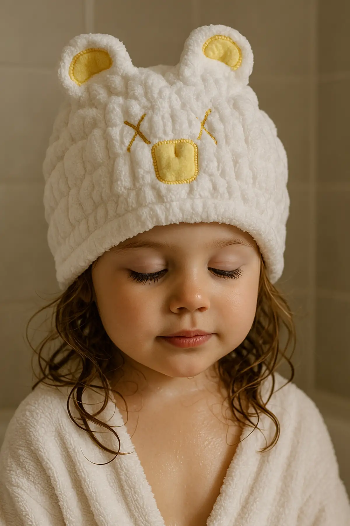 Beyaz Ve Sarı Renk Ayıcık Figürlü Saç Havlusu/ Bonesi Lastikli