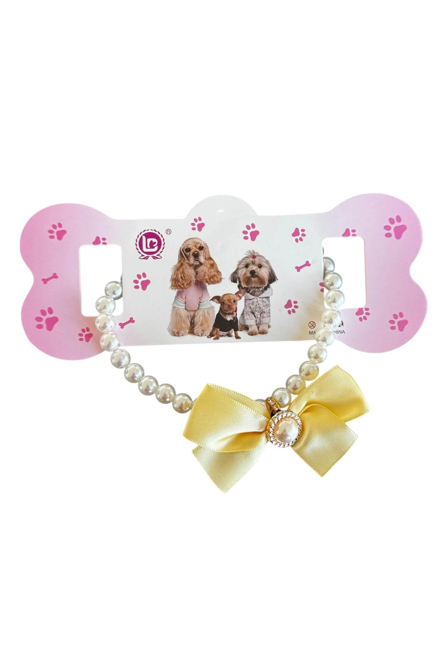 Beyaz Ve Sarı Renk Kurdele Figürlü İnci Detaylı L Beden Köpek Tasması