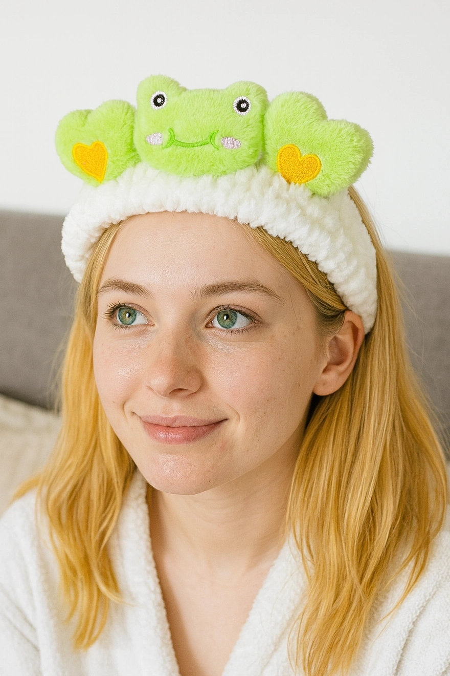 Beyaz Ve Yeşil Renk Kurbağa Figürlü Peluş Saç Bandı