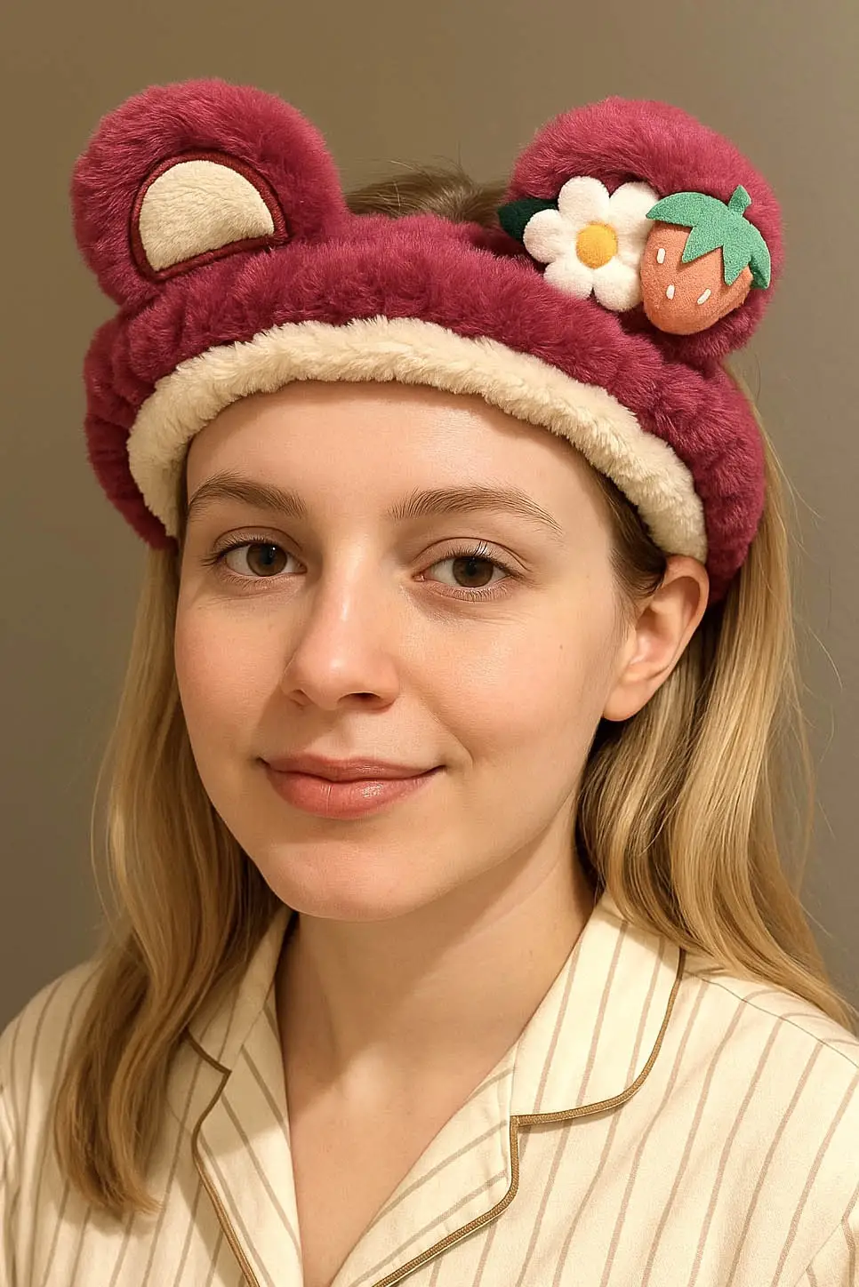 Fuşya Renk Çilek Ve Çiçek Figürlü Kulak Detaylı Peluş Saç Bandı