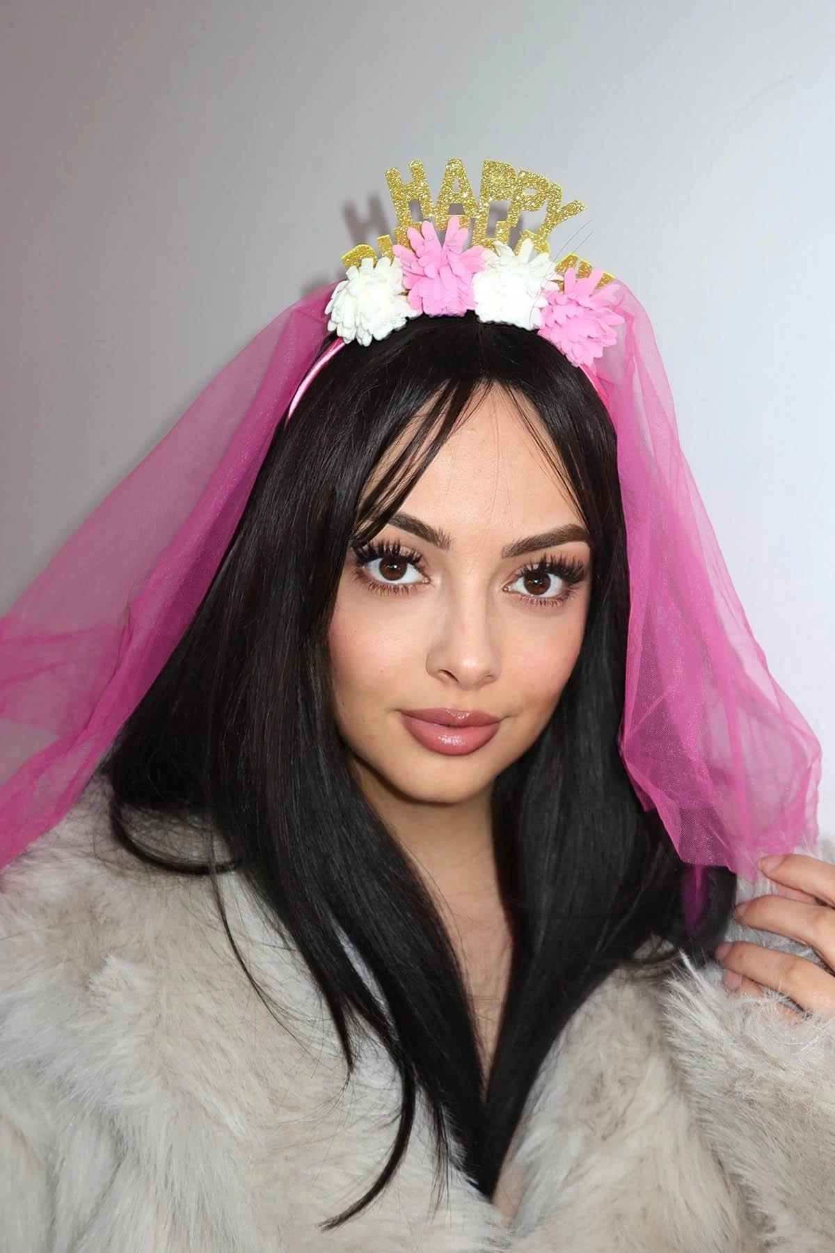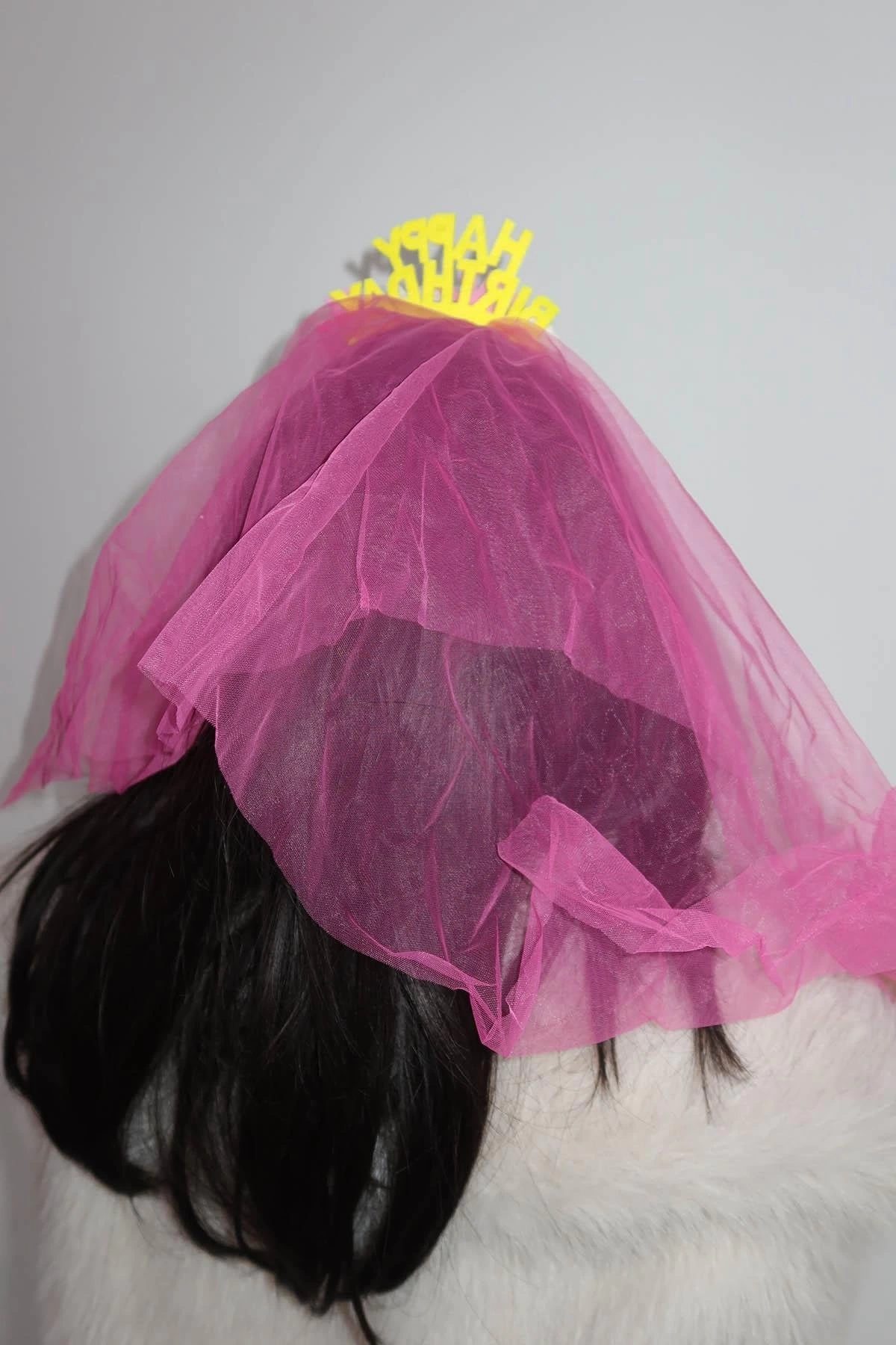Fuşya Renk Happy Birthday Yazılı Çiçek Figürlü Tül Detaylı Taç