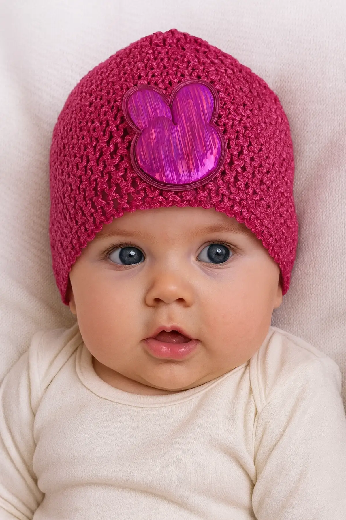 Fuşya Renk Tavşan Figürlü Örgü Detaylı Bebek Saç Bandı/ Saç Bonesi