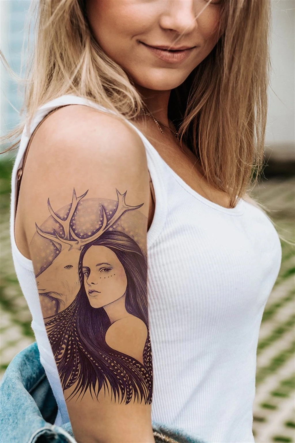Geçici Kadın Modelli ve Geyik Dövme Tattoo