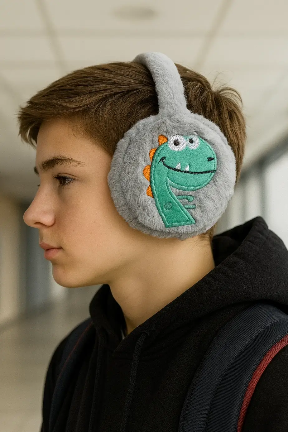 Gri Renk Dinazor Figürlü Peluş Erkek Çocuk Kulaklık
