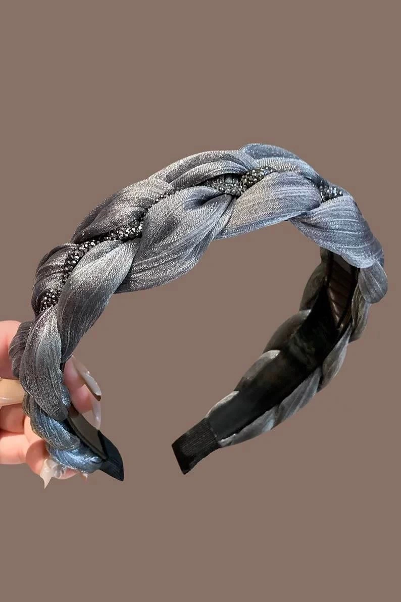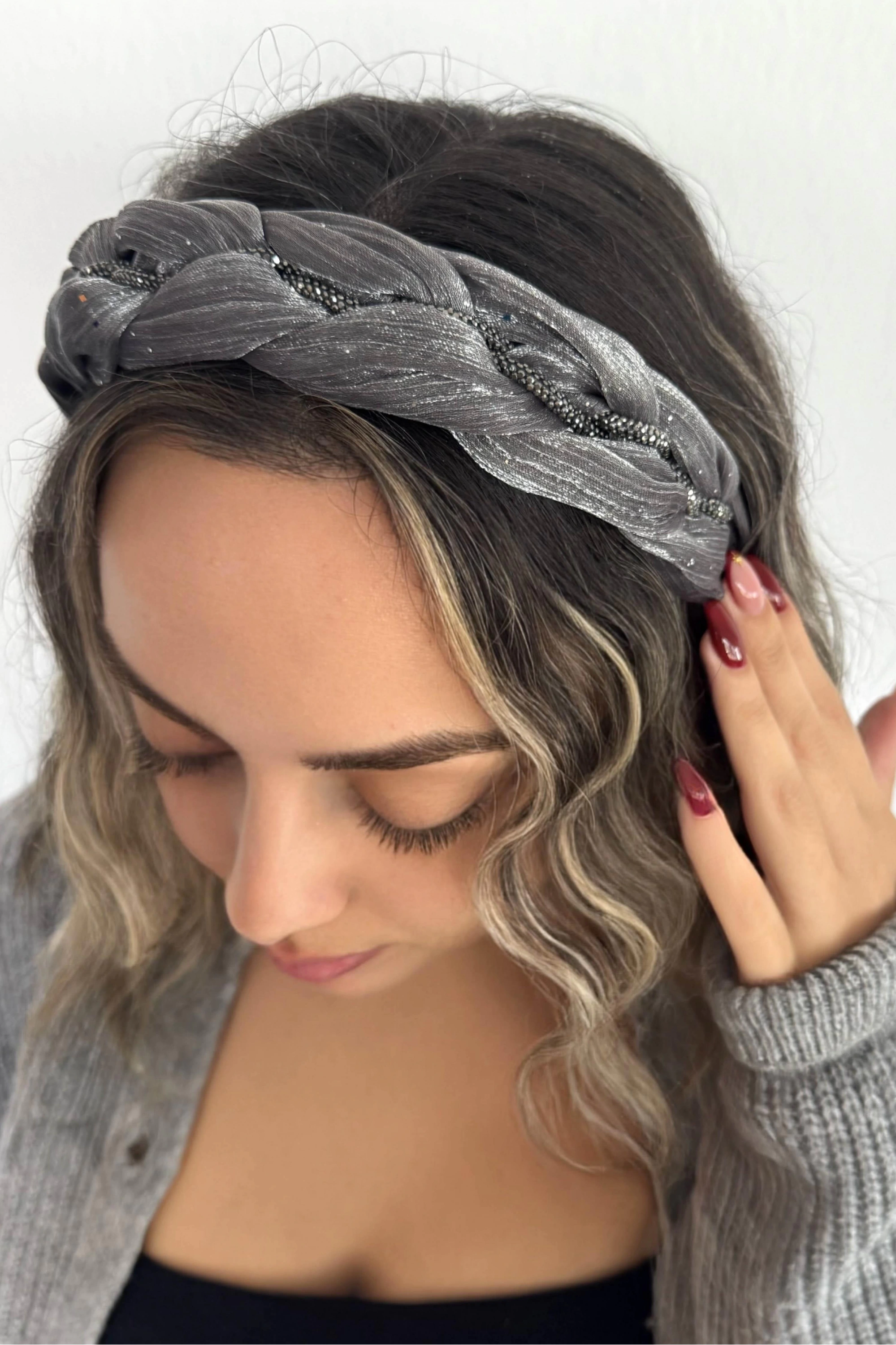 Gri Renk Taş Detaylı Örgülü Taç