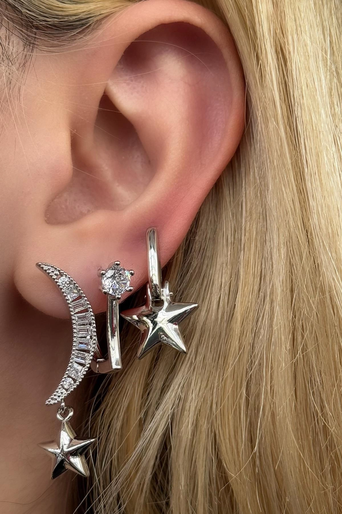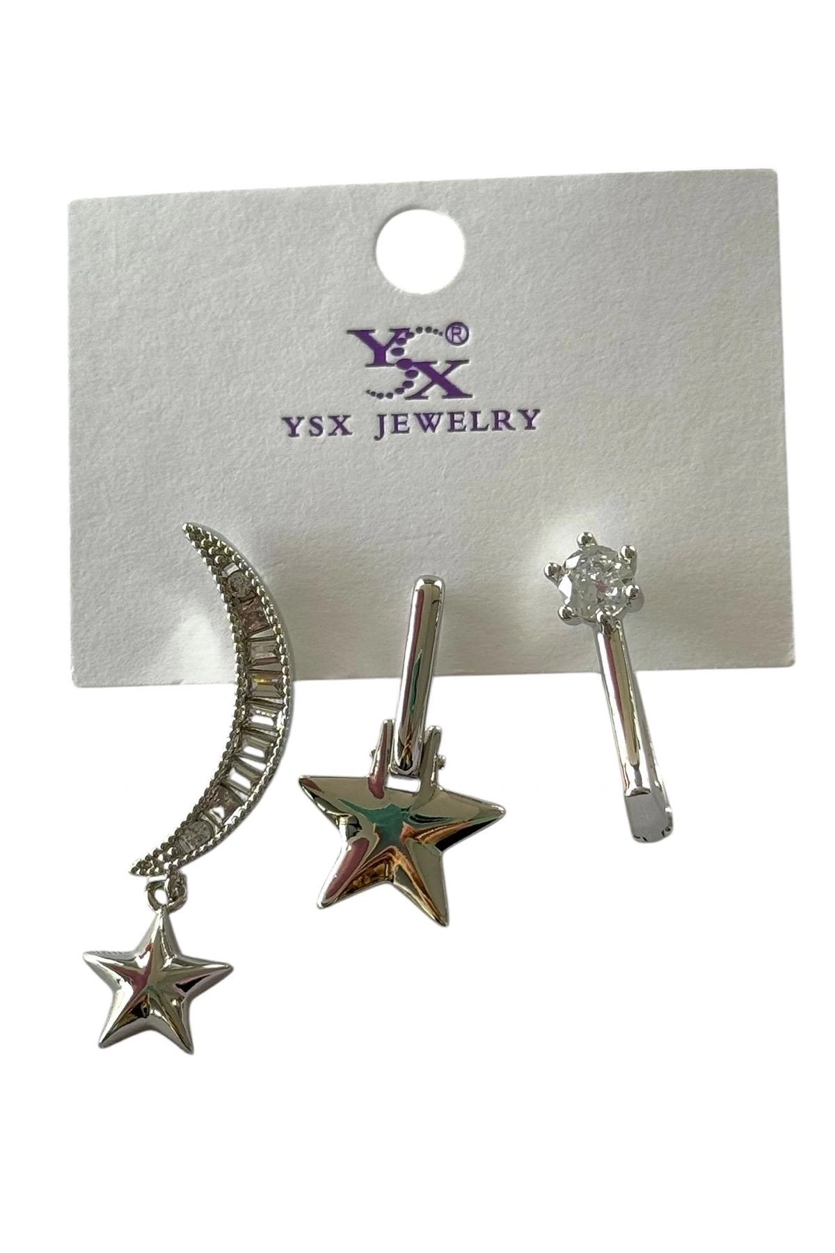 Gümüş Renk Ay Ve Yıldız Figürlü Taş Detaylı VİP 3'lü YSX Küpe Set