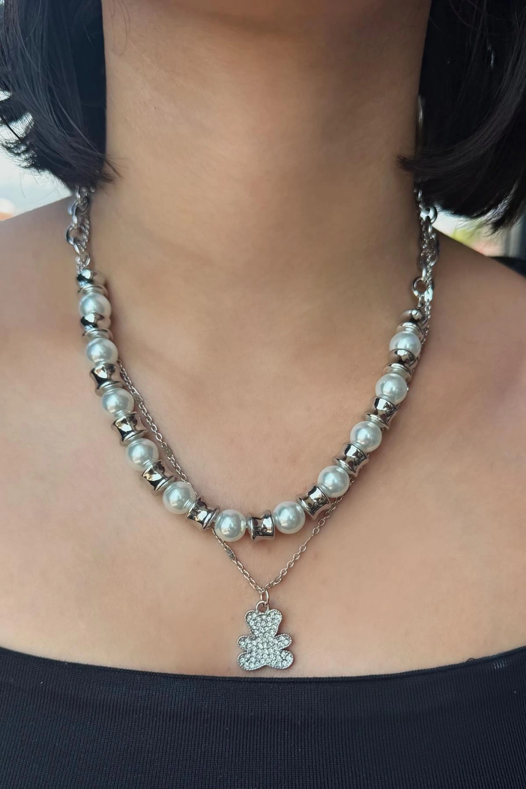 Gümüş Renk Ayı Figürlü İnci Detaylı Çoklu Kolye
