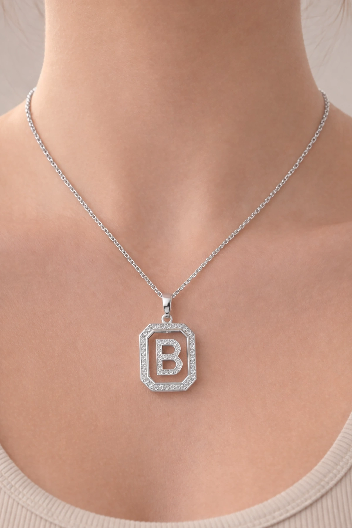 Gümüş Renk B Harf Taş Detaylı Çelik Kolye