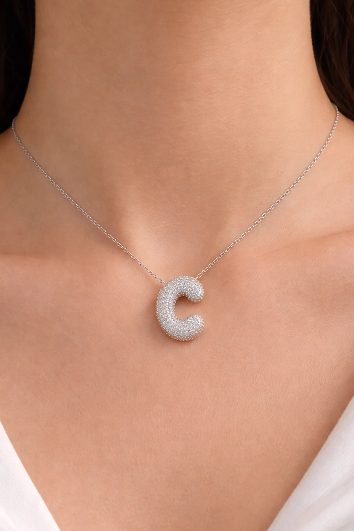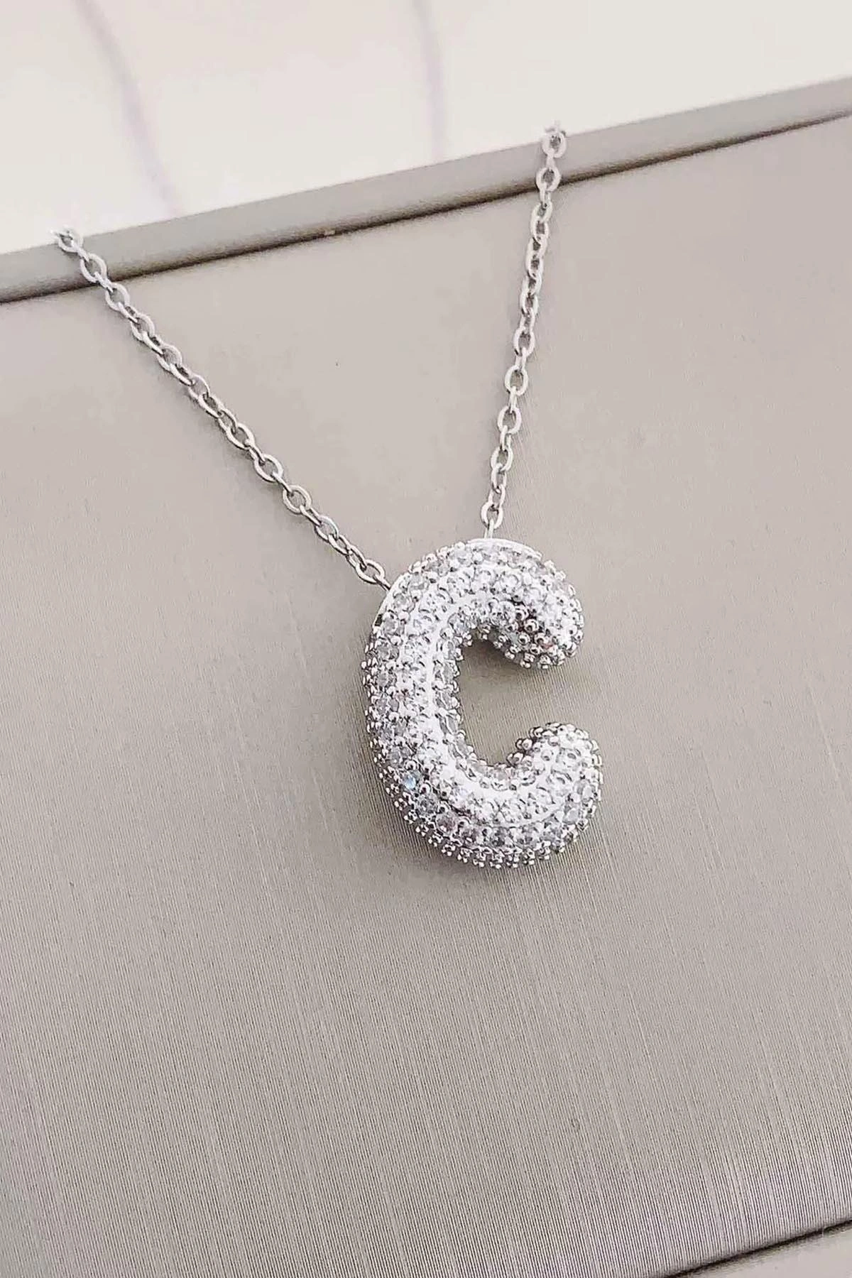 Gümüş Renk C Harf Taş Detaylı Çelik Kolye